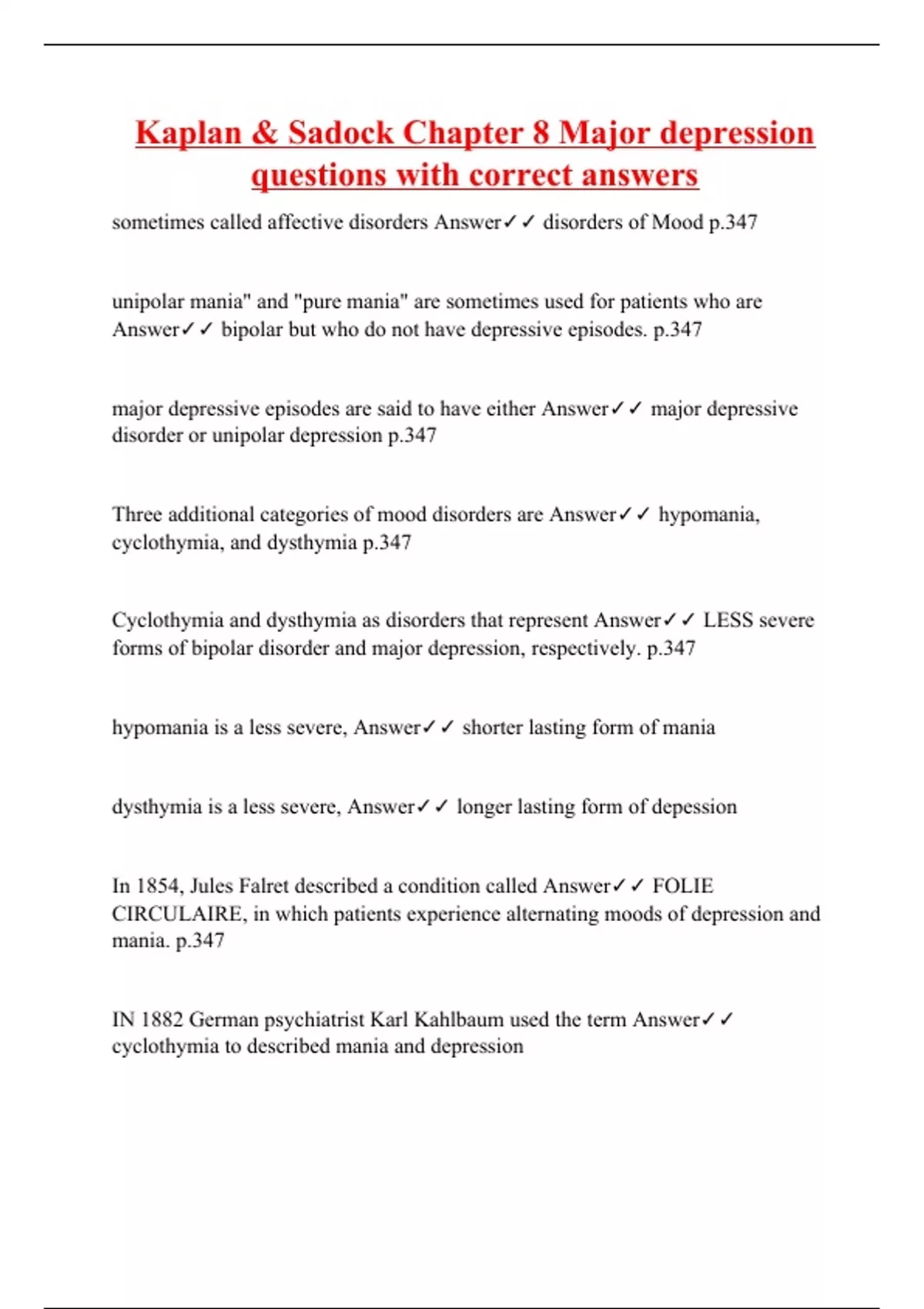 Kaplan & Sadock Chapter 8 Major depression questions with correct answers