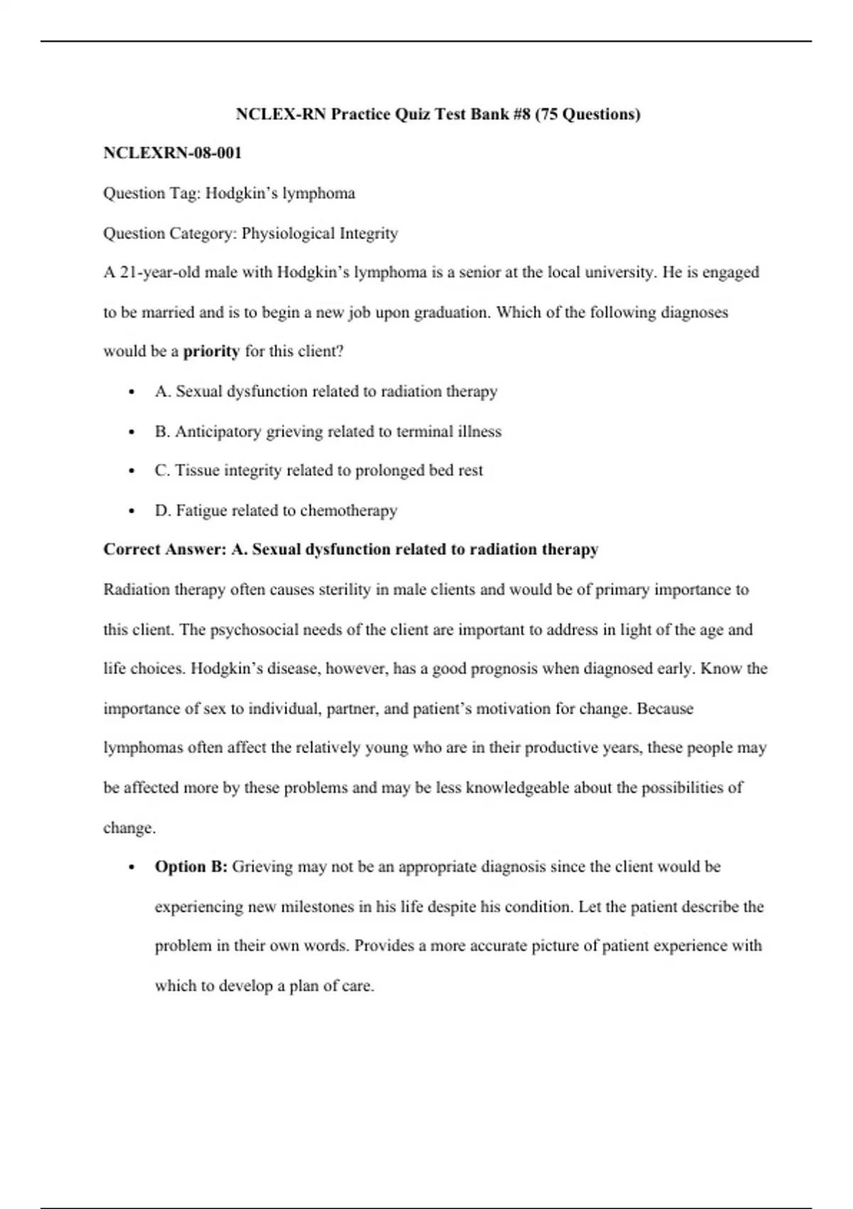 Question Tag: Hodgkin’s lymphoma Question Category: Physiological Integrity A 21-year-old male with Hodgkin’s lymphoma is a senior at the local university. He is engaged to be married and is to begin a new job upon graduation. Which of the following diagnoses would be a priority for this client? • A. Sexual dysfunction related to radiation therapy • B. Anticipatory grieving related to terminal illness • C. Tissue integrity related to prolonged bed rest • D. Fatigue related to chemotherap