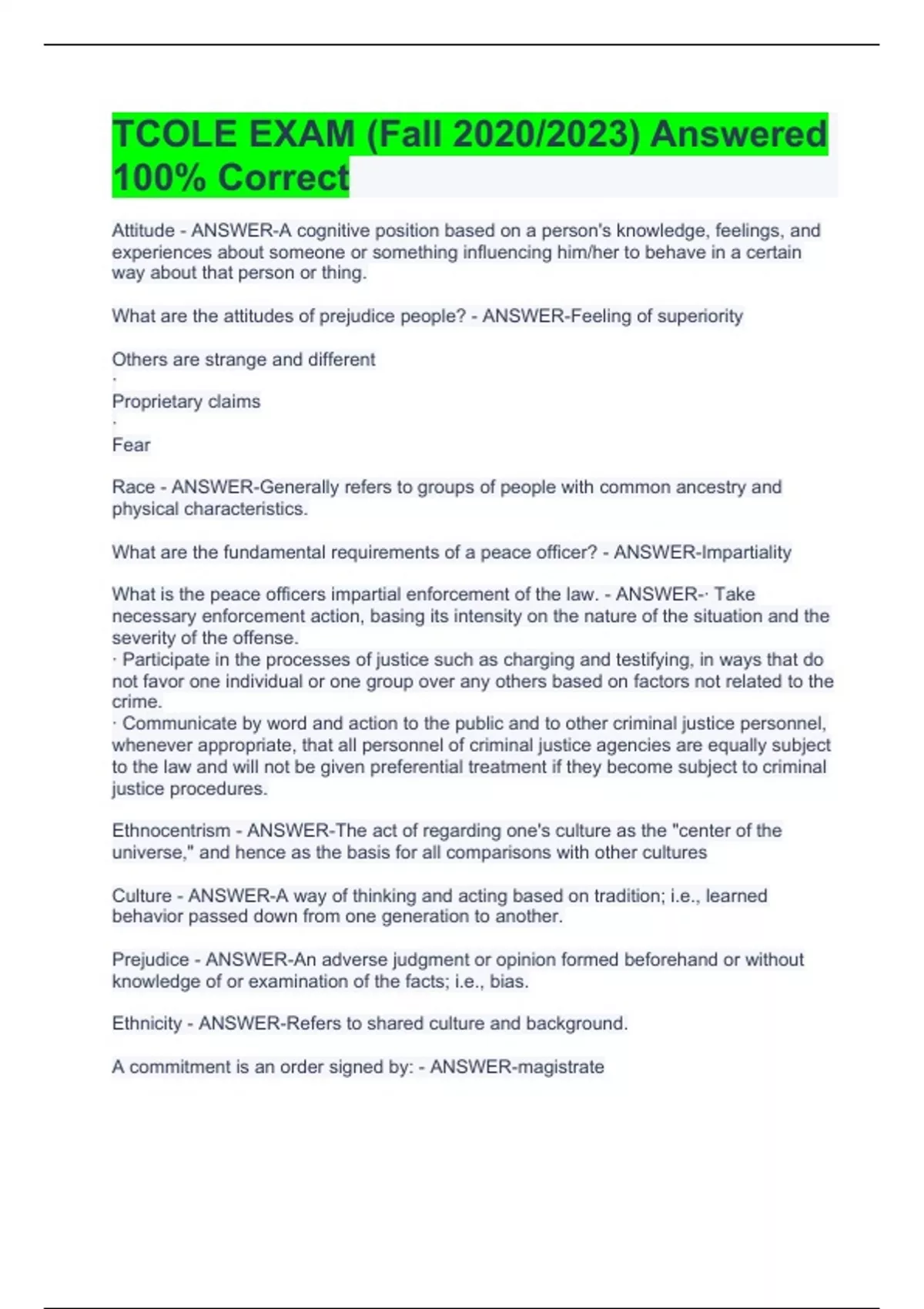 Attitude - ANSWER-A cognitive position based on a person's knowledge, feelings, and experiences about someone or something influencing him/her to behave in a certain way about that person or thing. What are the attitudes of prejudice people? - ANSWER-Feeling of superiority Others are strange and different · Proprietary claims · Fear Race - ANSWER-Generally refers to groups of people with common ancestry and physical characteristics. What are the fundamental requirements of a peace officer? - ANSWER-Impartiality What is the peace officers impartial enforcement of the law. - ANSWER-· Take necessary enforcement action, basing its intensity on the nature of the situation and the severity of the offense. · Participate in the processes of justice such as charging and testifying, in ways that do not favor one individual or one group over any others based on factors not related to the crime. · Communicate by word and action to the public and to other criminal justice personnel, whenever appropriate, that all personnel of criminal justice agencies are equally subject to the law and will not be given preferential treatment if they become subject to criminal justice procedures. Ethnocentrism - ANSWER-The act of regarding one's culture as the "center of the universe," and hence as the basis for all comparisons with other cultures Culture - ANSWER-A way of thinking and acting based on tradition; i.e., learned behavior passed down from one generation to another. Prejudice - ANSWER-An adverse judgment or opinion formed beforehand or without knowledge of or examination of the facts; i.e., bias. Ethnicity - ANSWER-Refers to shared culture and background. A commitment is an order signed by: - ANSWER-magistrate Which of the following statements is not true about the rules for fixing the amount of bail? - ANSWER-? A steady yellow light is? - ANSWER-A red light is about to appear. Stop unless you are already within the intersection. In order to frisk a stopped suspect, an officer must reasonably suspect that the suspect is: - ANSWER-? According to the TCOLE outline, what percentage of officer contacts require physical force? - ANSWER-? A peace officer's duty in handling a family dispute is to - ANSWER-? _____________ and _______________ make up the foundation on which the Wellness Pyramid is built. - ANSWER-? The area from which an arrested person may gain possession of a weapon or destroy evidence is: - ANSWER-Area of immediate control People are most likely to become angry when they - ANSWER-? A civil citation is served by? - ANSWER-? The following is not a type of crime scene sketch - ANSWER-Charted Preliminary investigative procedures for crimes against property include: - ANSWER-? Time must be devoted to exploring motives, possible omissions, and assessing the truth if ________________________. - ANSWER-? Which of the following is an objective to a pre-shift safety inspection? - ANSWER-Hand position A police supervisor has a/an __________duty to intervene to stop officers who are engaging in excessive force in their presence. - ANSWER-? Which two courts do not have original jurisdiction for any offense? - ANSWER-? Which of the following would be classified as a "Short Barrel Firearm"? - ANSWER-Shotgun with a 17 inch barrel (shorter than 18 inches) In addition to being effective in traffic law enforcement, motorcycle patrol can be used to - ANSWER-?
