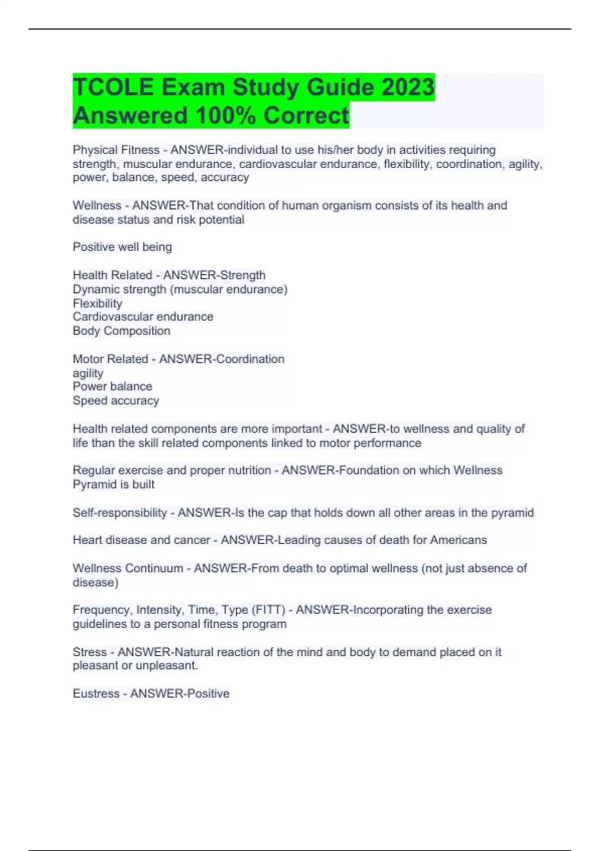 Physical Fitness - ANSWER-individual to use his/her body in activities requiring strength, muscular endurance, cardiovascular endurance, flexibility, coordination, agility, power, balance, speed, accuracy Wellness - ANSWER-That condition of human organism consists of its health and disease status and risk potential Positive well being Health Related - ANSWER-Strength Dynamic strength (muscular endurance) Flexibility Cardiovascular endurance Body Composition Motor Related - ANSWER-Coordination agility Power balance Speed accuracy Health related components are more important - ANSWER-to wellness and quality of life than the skill related components linked to motor performance Regular exercise and proper nutrition - ANSWER-Foundation on which Wellness Pyramid is built Self-responsibility - ANSWER-Is the cap that holds down all other areas in the pyramid Heart disease and cancer - ANSWER-Leading causes of death for Americans Wellness Continuum - ANSWER-From death to optimal wellness (not just absence of disease) Frequency, Intensity, Time, Type (FITT) - ANSWER-Incorporating the exercise guidelines to a personal fitness program Stress - ANSWER-Natural reaction of the mind and body to demand placed on it pleasant or unpleasant. Eustress - ANSWER-Positive Distress - ANSWER-Negative Acute Stress - ANSWER-Short term stress with a quick resolution Chronic stress - ANSWER-Cumulative stress Prolonged unrelieved wear and tear results from too many demands Critical Incident Stress (CIS) - ANSWER-Is Incident specific Heavy duty stress that causes psychological and physical discomfort for 2 days to 1 month Post traumatic stress disorder (PISD) - ANSWER-Long lasting disruptive changes in a person life. Symptoms are prolonged past 1 month. The person is unable to make the event part of their past keeping it part of their present Stressor - ANSWER-Is a demand, real or imagine, that disrupts a person's equilibrium and initiates the stress response Fight or Flight - ANSWER-A normal response to a violent situation Critical Incident Stress (CIS) - ANSWER-A traumatic event that causes a strong emotional reaction. Potential to interfere with an individual ability to function at the scene or later Post Traumatic Stress Disorder (PTSD) - ANSWER-More severe Persist after 1 month after incident and continue to affect person's life As if they are reliving it and not just remembering it . Five phases of transition - ANSWER-That a person who experience traumatic events typically go through. Denial Phase Anger Phase Bargaining Phase Depression Phase Acceptance Phase Flashbacks - ANSWER-Relative event that recalls a past traumatic event