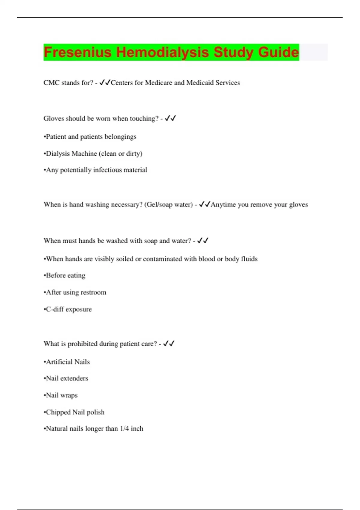 CMC stands for? - Centers for Medicare and Medicaid Services Gloves should be worn when touching? - •Patient and patients belongings •Dialysis Machine (clean or dirty) •Any potentially infectious material When is hand washing necessary? (Gel/soap water) - Anytime you remove your gloves When must hands be washed with soap and water? - •When hands are visibly soiled or contaminated with blood or body fluids •Before eating •After using restroom •C-diff exposure What is prohibited during patient care? - •Artificial Nails •Nail extenders •Nail wraps •Chipped Nail polish •Natural nails longer than 1/4 inch