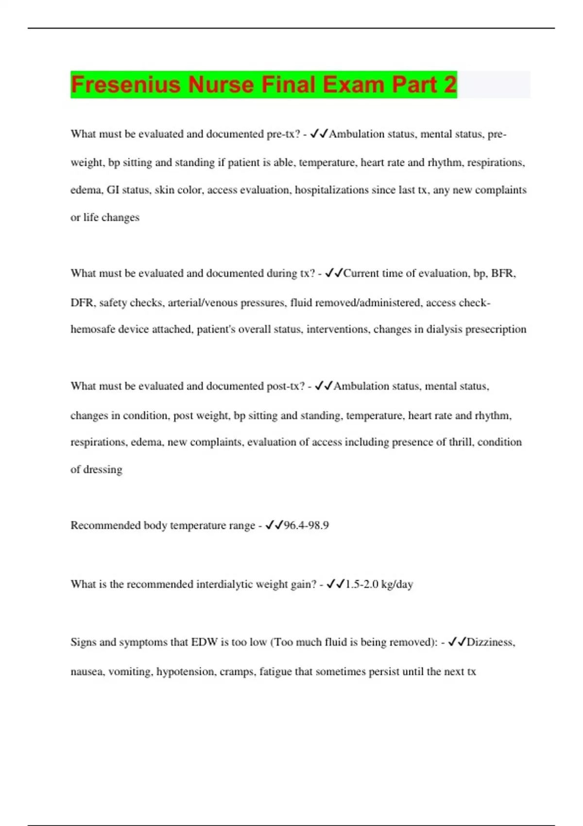 What must be evaluated and documented pre-tx? - Ambulation status, mental status, preweight, bp sitting and standing if patient is able, temperature, heart rate and rhythm, respirations, edema, GI status, skin color, access evaluation, hospitalizations since last tx, any new complaints or life changes What must be evaluated and documented during tx? - Current time of evaluation, bp, BFR, DFR, safety checks, arterial/venous pressures, fluid removed/administered, access checkhemosafe device attached, patient's overall status, interventions, changes in dialysis presecription What must be evaluated and documented post-tx? - Ambulation status, mental status, changes in condition, post weight, bp sitting and standing, temperature, heart rate and rhythm, respirations, edema, new complaints, evaluation of access including presence of thrill, condition of dressing Recommended body temperature range - 96.4-98.9 What is the recommended interdialytic weight gain? - 1.5-2.0 kg/day Signs and symptoms that EDW is too low (Too much fluid is being removed): - Dizziness, nausea, vomiting, hypotension, cramps, fatigue that sometimes persist until the next tx