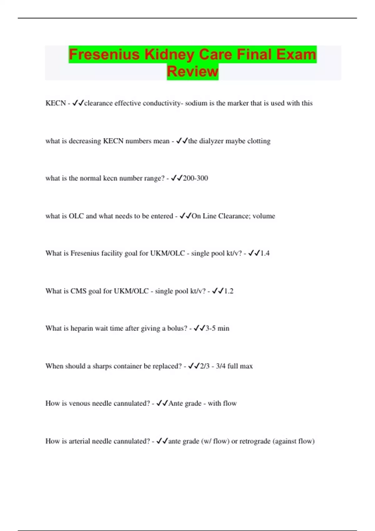 KECN - clearance effective conductivity- sodium is the marker that is used with this what is decreasing KECN numbers mean - the dialyzer maybe clotting what is the normal kecn number range? - 200-300 what is OLC and what needs to be entered - On Line Clearance; volume What is Fresenius facility goal for UKM/OLC - single pool kt/v? - 1.4 What is CMS goal for UKM/OLC - single pool kt/v? - 1.2 What is heparin wait time after giving a bolus? - 3-5 min When should a sharps container be replaced? - 2/3 - 3/4 full max How is venous needle cannulated? - Ante grade - with flow How is arterial needle cannulated? - ante grade (w/ flow) or retrograde (against flow