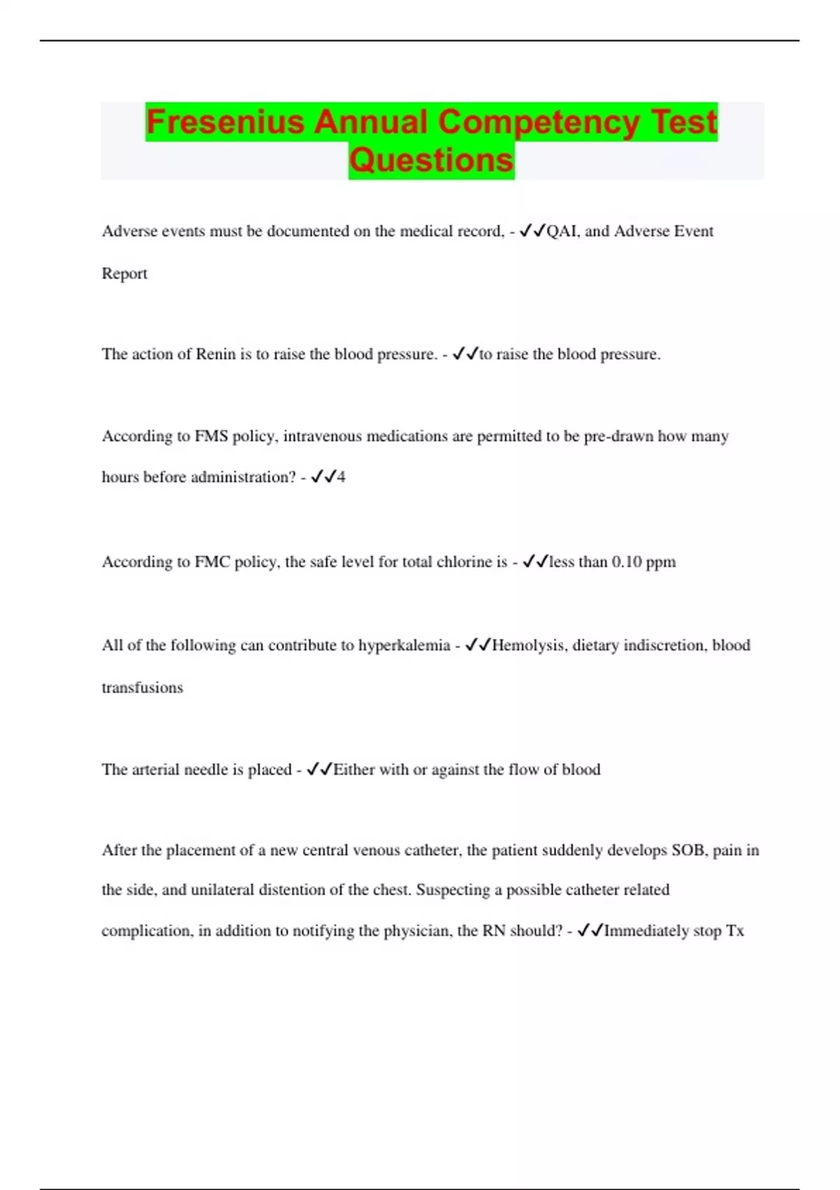 Adverse events must be documented on the medical record, - QAI, and Adverse Event Report The action of Renin is to raise the blood pressure. - to raise the blood pressure. According to FMS policy, intravenous medications are permitted to be pre-drawn how many hours before administration? - 4 According to FMC policy, the safe level for total chlorine is - less than 0.10 ppm All of the following can contribute to hyperkalemia - Hemolysis, dietary indiscretion, blood transfusions The arterial needle is placed - Either with or against the flow of blood After the placement of a new central venous catheter, the patient suddenly develops SOB, pain in the side, and unilateral distention of the chest. Suspecting a possible catheter related complication, in addition to notifying the physician, the RN should? - Immediately stop Tx