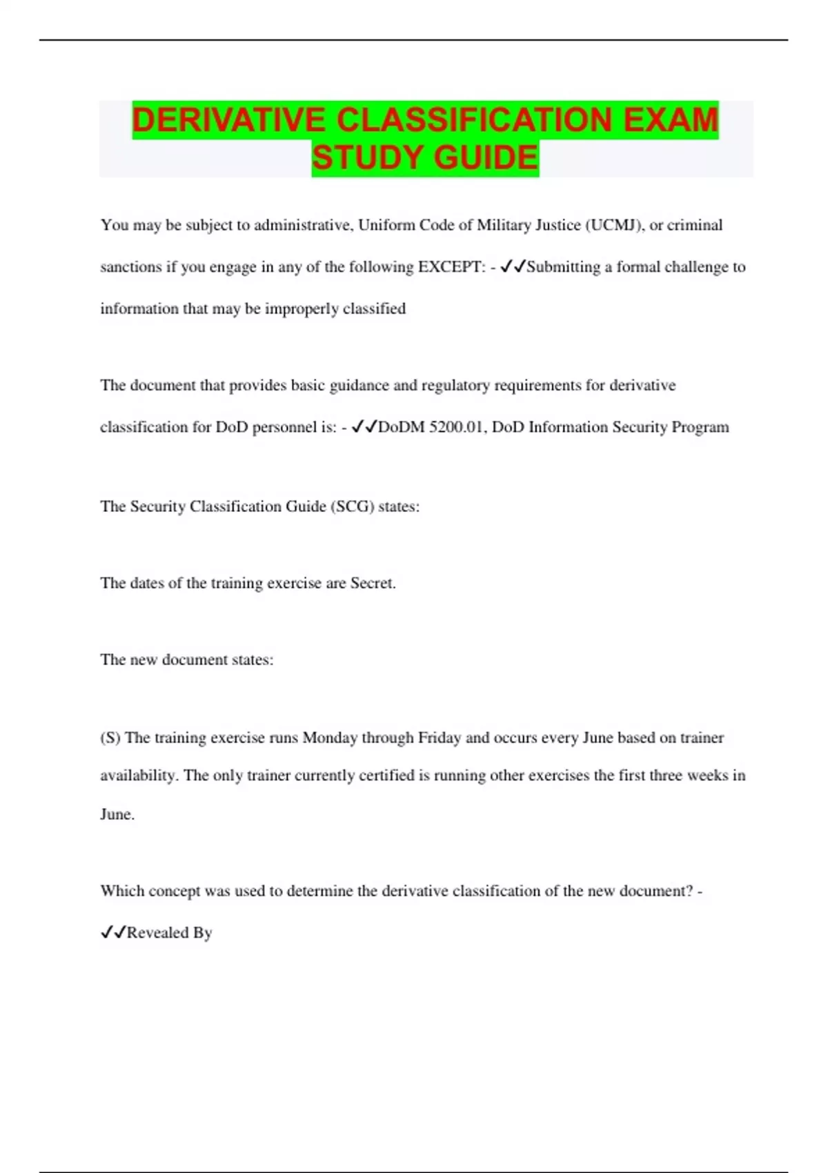 You may be subject to administrative, Uniform Code of Military Justice (UCMJ), or criminal sanctions if you engage in any of the following EXCEPT: - Submitting a formal challenge to information that may be improperly classified The document that provides basic guidance and regulatory requirements for derivative classification for DoD personnel is: - DoDM 5200.01, DoD Information Security Program The Security Classification Guide (SCG) states: The dates of the training exercise are Secret. The new document states: (S) The training exercise runs Monday through Friday and occurs every June based on trainer availability. The only trainer currently certified is running other exercises the first three weeks in June. Which concept was used to determine the derivative classification of the new document? - Revealed By