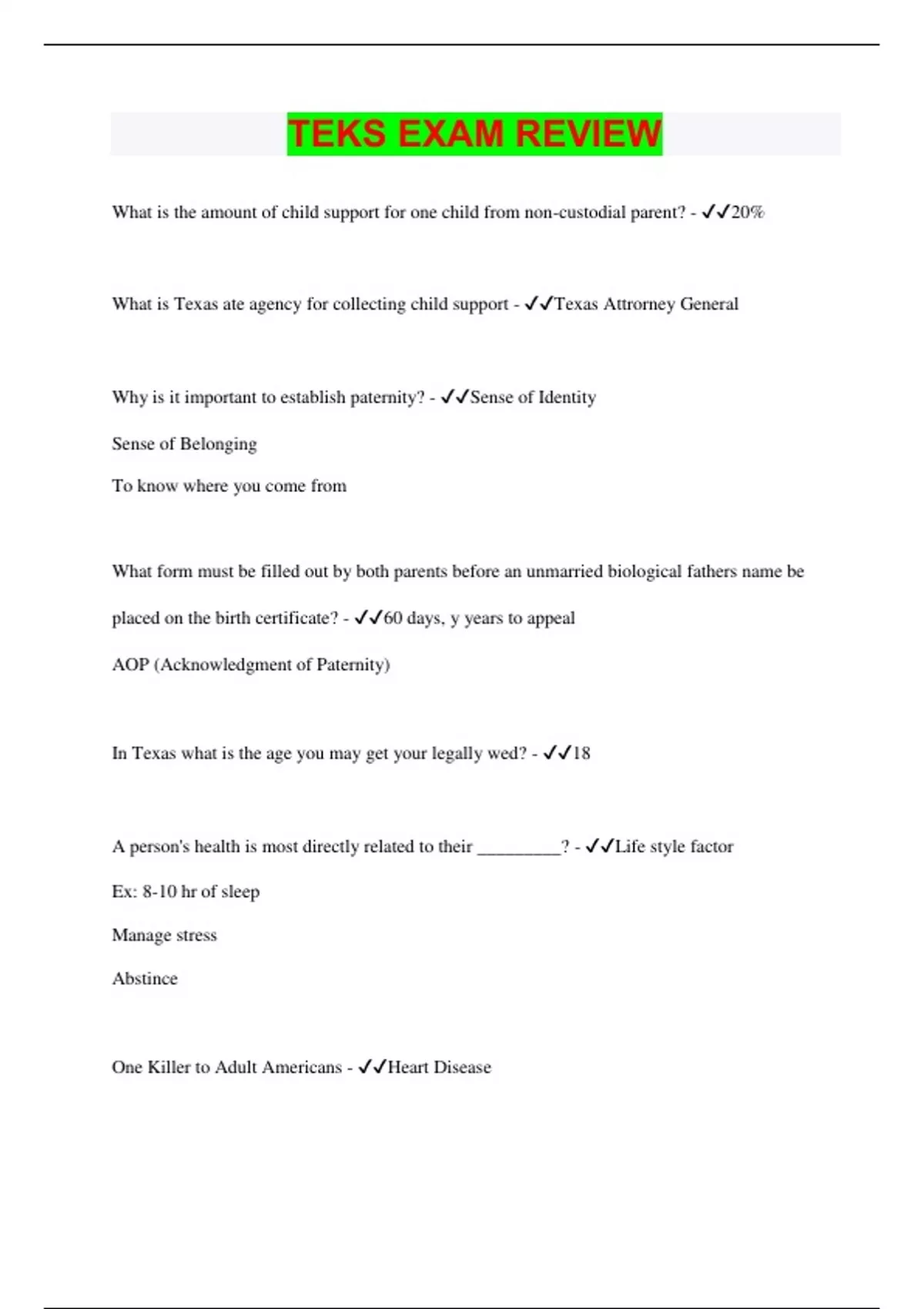 What is the amount of child support for one child from non-custodial parent? - 20% What is Texas ate agency for collecting child support - Texas Attrorney General Why is it important to establish paternity? - Sense of Identity Sense of Belonging To know where you come from What form must be filled out by both parents before an unmarried biological fathers name be placed on the birth certificate? - 60 days, y years to appeal AOP (Acknowledgment of Paternity) In Texas what is the age you may get your legally wed? - 18 A person's health is most directly related to their _________? - Life style factor Ex: 8-10 hr of sleep Manage stress Abstince One Killer to Adult Americans - Heart Disease