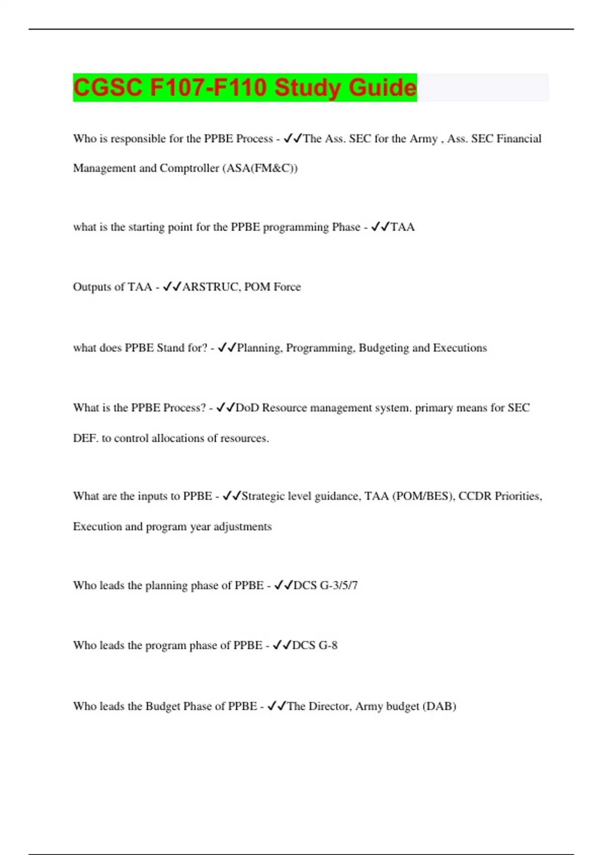 Who is responsible for the PPBE Process - The Ass. SEC for the Army , Ass. SEC Financial Management and Comptroller (ASA(FM&C)) what is the starting point for the PPBE programming Phase - TAA Outputs of TAA - ARSTRUC, POM Force what does PPBE Stand for? - Planning, Programming, Budgeting and Executions What is the PPBE Process? - DoD Resource management system. primary means for SEC DEF. to control allocations of resources. What are the inputs to PPBE - Strategic level guidance, TAA (POM/BES), CCDR Priorities, Execution and program year adjustments Who leads the planning phase of PPBE - DCS G-3/5/7 Who leads the program phase of PPBE - DCS G-8 Who leads the Budget Phase of PPBE - The Director, Army budget (DAB)