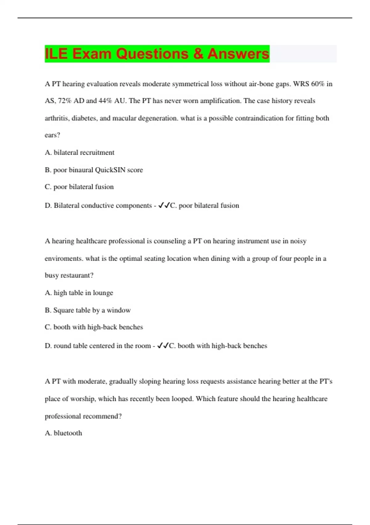 A PT hearing evaluation reveals moderate symmetrical loss without air-bone gaps. WRS 60% in AS, 72% AD and 44% AU. The PT has never worn amplification. The case history reveals arthritis, diabetes, and macular degeneration. what is a possible contraindication for fitting both ears? A. bilateral recruitment B. poor binaural QuickSIN score C. poor bilateral fusion D. Bilateral conductive components - C. poor bilateral fusion A hearing healthcare professional is counseling a PT on hearing instrument use in noisy enviroments. what is the optimal seating location when dining with a group of four people in a busy restaurant? A. high table in lounge B. Square table by a window C. booth with high-back benches D. round table centered in the room - C. booth with high-back benches A PT with moderate, gradually sloping hearing loss requests assistance hearing better at the PT's place of worship, which has recently been looped. Which feature should the hearing healthcare professional recommend?