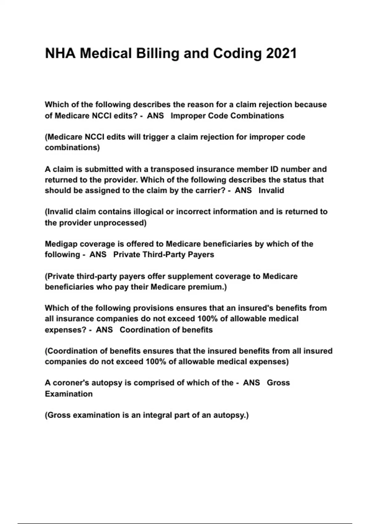 NHA Medical Billing and Coding 2021 UPDATED 2023 QUESTIONS & ANSWERS ( A+ GRADED 100% VERIFIED)