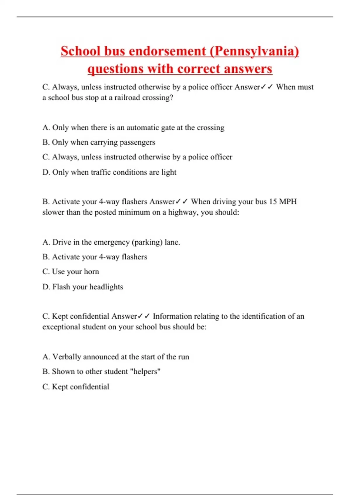 C. Always, unless instructed otherwise by a police officer Answer When must a school bus stop at a railroad crossing? A. Only when there is an automatic gate at the crossing B. Only when carrying passengers C. Always, unless instructed otherwise by a police officer D. Only when traffic conditions are light B. Activate your 4-way flashers Answer When driving your bus 15 MPH slower than the posted minimum on a highway, you should: A. Drive in the emergency (parking) lane. B. Activate your 4-way flashers C. Use your horn D. Flash your headlights C. Kept confidential Answer Information relating to the identification of an exceptional student on your school bus should be: A. Verbally announced at the start of the run B. Shown to other student "helpers" C. Kept confidential