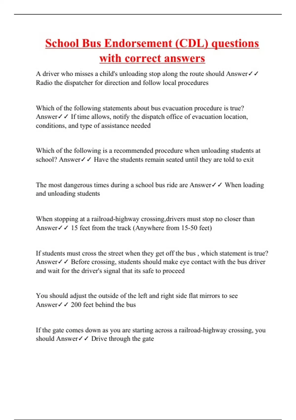 A driver who misses a child's unloading stop along the route should Answer Radio the dispatcher for direction and follow local procedures Which of the following statements about bus evacuation procedure is true? Answer If time allows, notify the dispatch office of evacuation location, conditions, and type of assistance needed Which of the following is a recommended procedure when unloading students at school? Answer Have the students remain seated until they are told to exit The most dangerous times during a school bus ride are Answer When loading and unloading students When stopping at a railroad-highway crossing,drivers must stop no closer than Answer 15 feet from the track (Anywhere from 15-50 feet) If students must cross the street when they get off the bus , which statement is true? Answer Before crossing, students should make eye contact with the bus driver and wait for the driver's signal that its safe to proceed You should adjust the outside of the left and right side flat mirrors to see Answer 200 feet behind the bus
