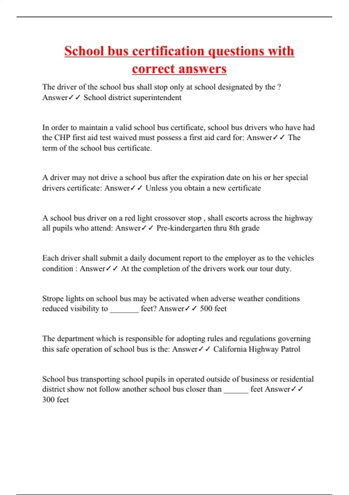 The driver of the school bus shall stop only at school designated by the ? Answer School district superintendent In order to maintain a valid school bus certificate, school bus drivers who have had the CHP first aid test waived must possess a first aid card for: Answer The term of the school bus certificate. A driver may not drive a school bus after the expiration date on his or her special drivers certificate: Answer Unless you obtain a new certificate A school bus driver on a red light crossover stop , shall escorts across the highway all pupils who attend: Answer Pre-kindergarten thru 8th grade Each driver shall submit a daily document report to the employer as to the vehicles condition : Answer At the completion of the drivers work our tour duty. Strope lights on school bus may be activated when adverse weather conditions reduced visibility to _______ feet? Answer 500 feet The department which is responsible for adopting rules and regulations governing this safe operation of school bus is the: Answer California Highway Patrol School bus transporting school pupils in operated outside of business or residential district show not follow another school bus closer than