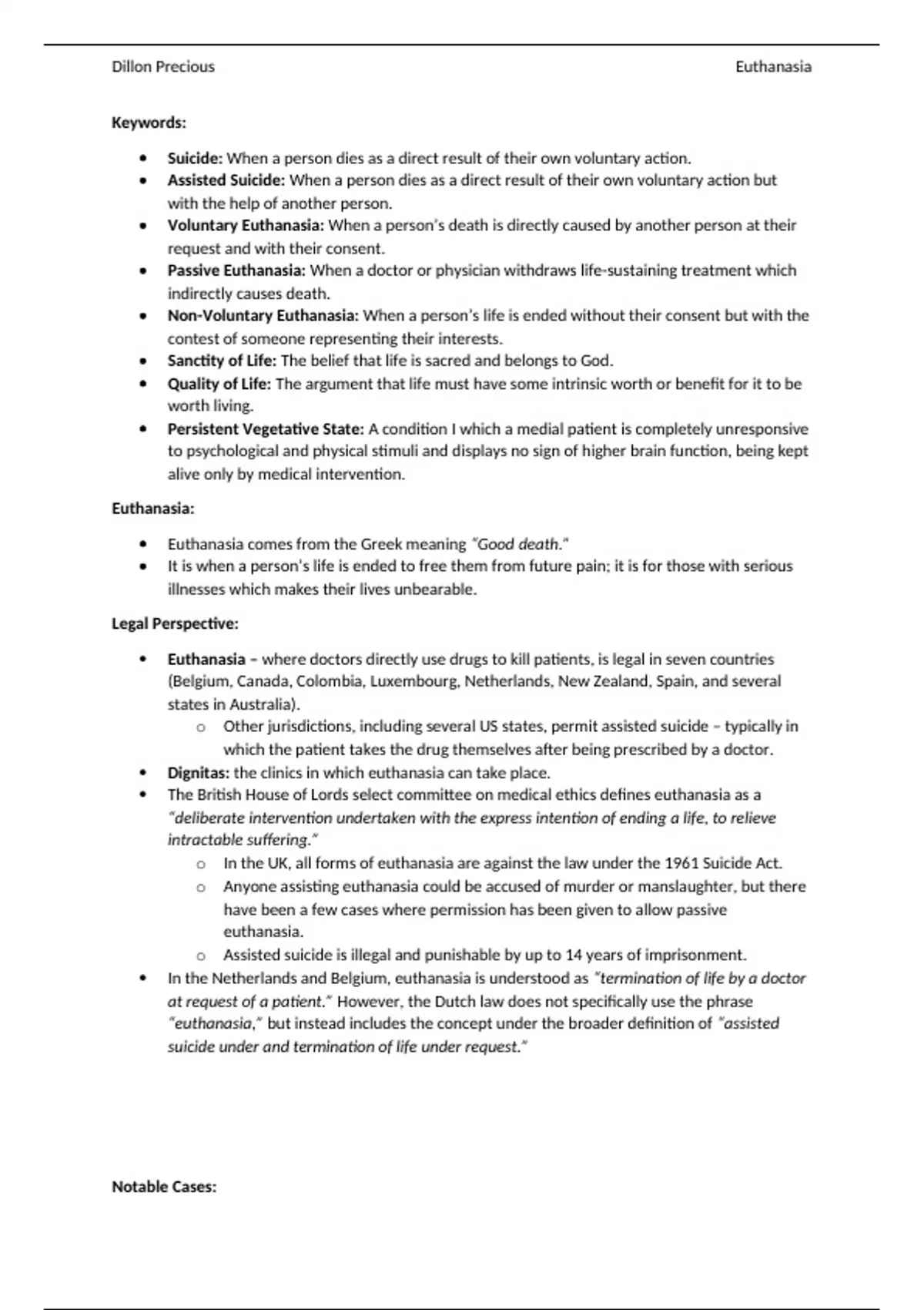 Voluntary Euthanasia: When a person’s death is directly caused by another person at their