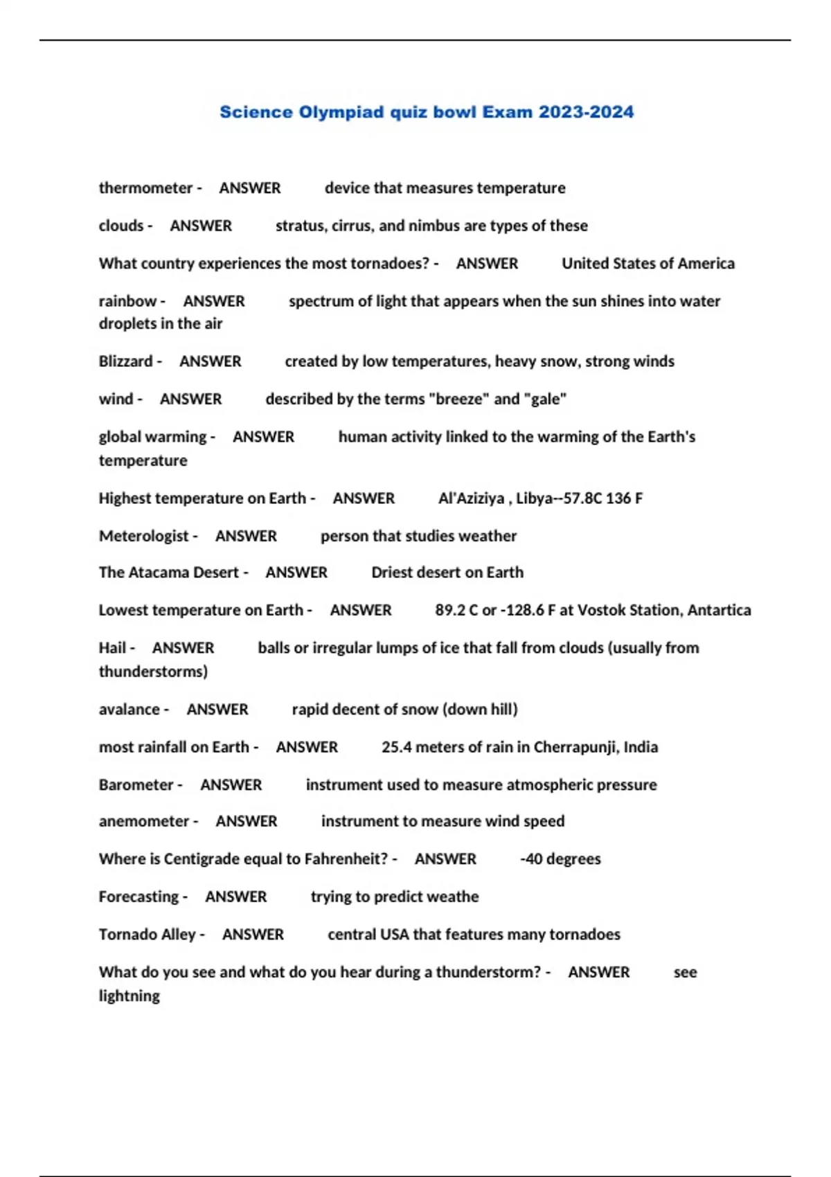 Science Olympiad quiz bowl Exam