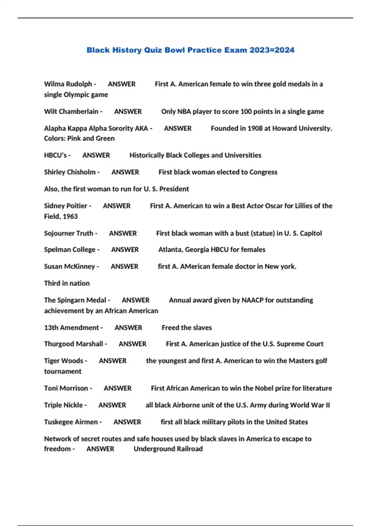 Black History Quiz Bowl Practice Exam 2023=2024...