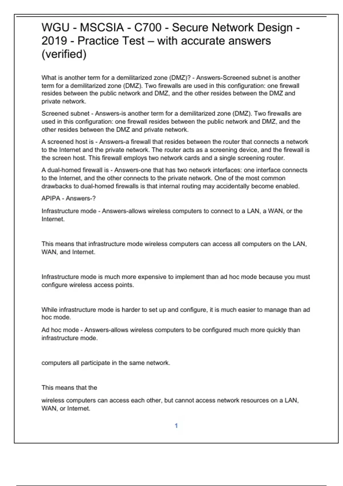 WGU - MSCSIA - C700 - Secure Network Design - 2019 - Practice Test – with accurate answers (verified)Graded A