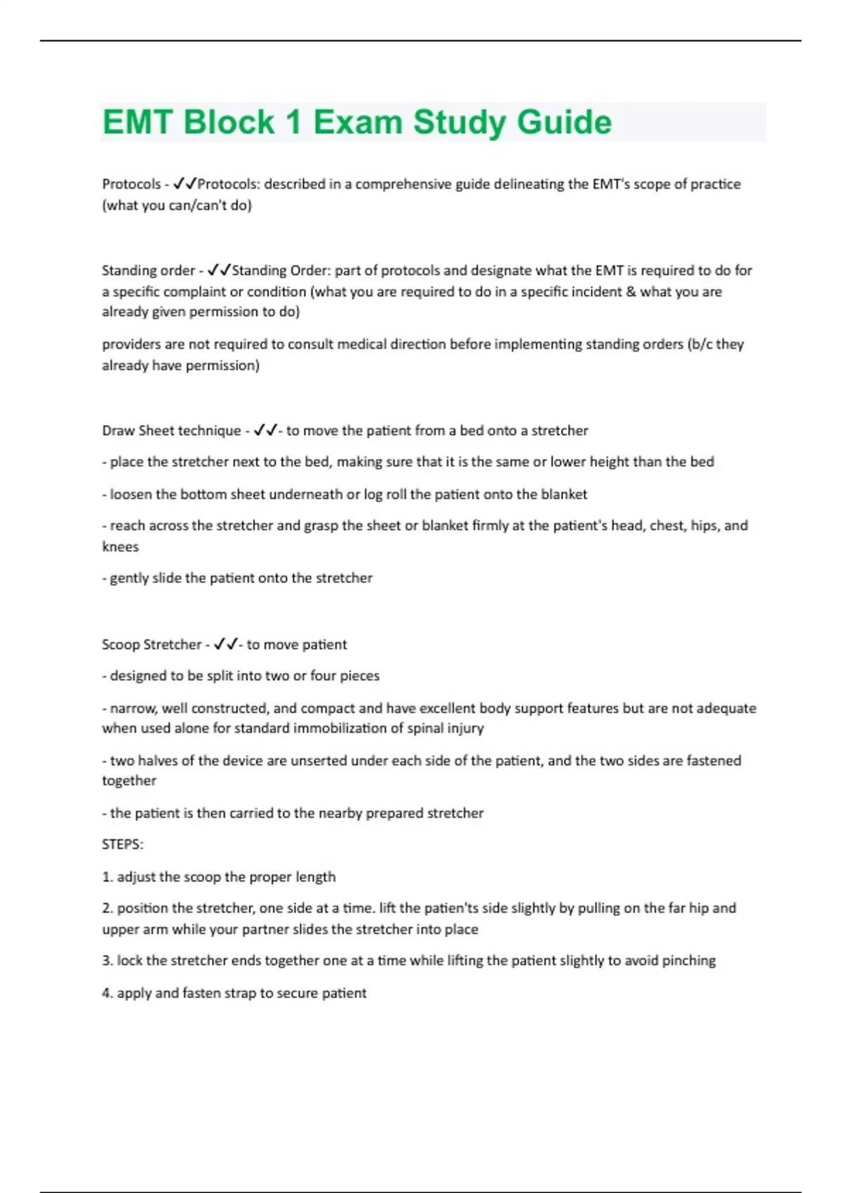 Protocols - Protocols: described in a comprehensive guide delineating the EMT's scope of practice (what you can/can't do) Standing order - Standing Order: part of protocols and designate what the EMT is required to do for a specific complaint or condition (what you are required to do in a specific incident & what you are already given permission to do) providers are not required to consult medical direction before implementing standing orders (b/c they already have permission) Draw Sheet technique - - to move the patient from a bed onto a stretcher - place the stretcher next to the bed, making sure that it is the same or lower height than the bed - loosen the bottom sheet underneath or log roll the patient onto the blanket - reach across the stretcher and grasp the sheet or blanket firmly at the patient's head, chest, hips, and knees - gently slide the patient onto the stretcher Scoop Stretcher - - to move patient - designed to be split into two or four pieces - narrow, well constructed, and compact and have excellent body support features but are not adequate when used alone for standard immobilization of spinal injury - two halves of the device are unserted under each side of the patient, and the two sides are fastened together - the patient is then carried to the nearby prepared stretcher STEPS: 1. adjust the scoop the proper length 2. position the stretcher, one side at a time. lift the patien'ts side slightly by pulling on the far hip and upper arm while your partner slides the stretcher into place 3. lock the stretcher ends together one at a time while lifting the patient slightly to avoid pinching 4. apply and fasten strap to secure patientNeonatal Isolette - - when you need to transport a neonatal (newborn) patient from one hospital to another - sometimes referred to as an incubator - the isolette keeps the neonatal patient warm with moistened air in a clean environment and helps to protect the infant from noise, drafts, infection and excess handling Different types of Non-Urgent Moves - - used when both scene and patient are stable - Direct Ground Lift: *for supine (lying upward) patients with no suspected spinal injury *for patients who need to be carried over some distance *EMTs stand side by side to lift/carry the patient Extremity Lift: - - for patients with no suspected spinal injury who are supine or sitting - patients who are in a small space - one EMT is at the patient's head and the other at the patient's feet - coordinate moves verbally