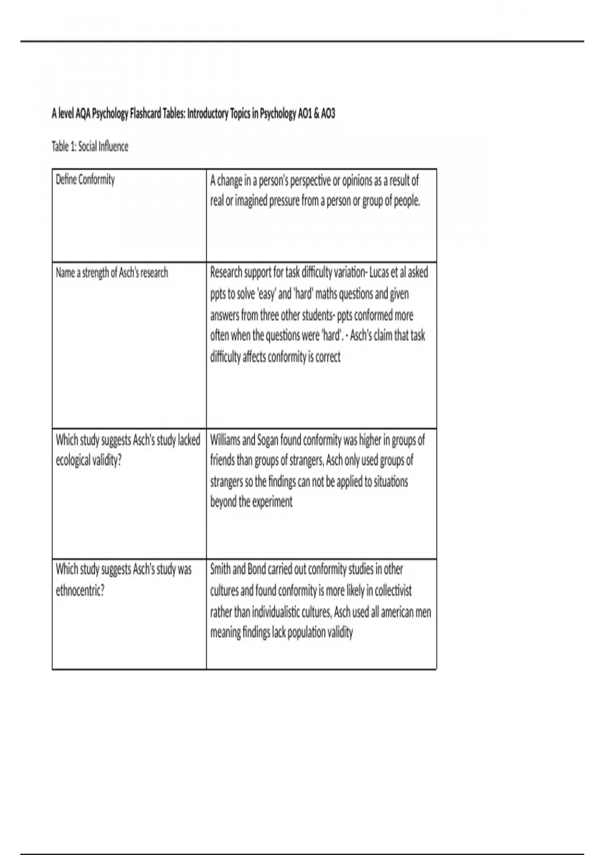 A level AQA Psychology Flashcard Tables: Introductory Topics in Psychology AO1 & AO3
