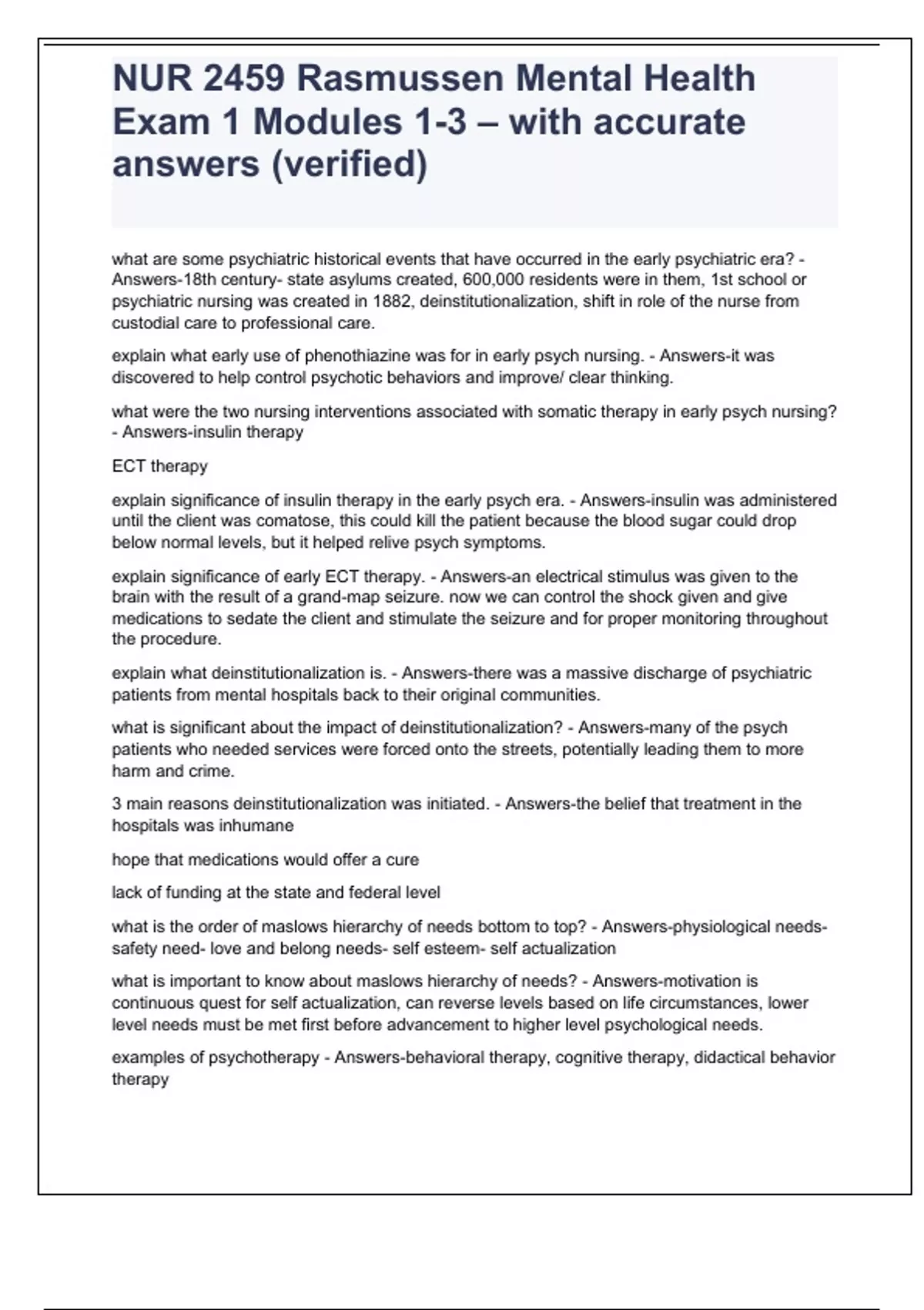what are some psychiatric historical events that have occurred in the early psychiatric era? - Answers-18th century- state asylums created, 600,000 residents were in them, 1st school or psychiatric nursing was created in 1882, deinstitutionalization, shift in role of the nurse from custodial care to professional care. explain what early use of phenothiazine was for in early psych nursing. - Answers-it was discovered to help control psychotic behaviors and improve/ clear thinking. what were the two nursing interventions associated with somatic therapy in early psych nursing? - Answers-insulin therapy ECT therapy explain significance of insulin therapy in the early psych era. - Answers-insulin was administered until the client was comatose, this could kill the patient because the blood sugar could drop below normal levels, but it helped relive psych symptoms. explain significance of early ECT therapy. - Answers-an electrical stimulus was given to the brain with the result of a grand-map seizure. now we can control the shock given and give medications to sedate the client and stimulate the seizure and for proper monitoring throughout the procedure. explain what deinstitutionalization is. - Answers-there was a massive discharge of psychiatric patients from mental hospitals back to their original communities. what is significant about the impact of deinstitutionalization? - Answers-many of the psych patients who needed services were forced onto the streets, potentially leading them to more harm and crime. 3 main reasons deinstitutionalization was initiated. - Answers-the belief that treatment in the hospitals was inhumane hope that medications would offer a cure lack of funding at the state and federal level what is the order of maslows hierarchy of needs bottom to top? - Answers-physiological needs-safety need- love and belong needs- self esteem- self actualization what is important to know about maslows hierarchy of needs? - Answers-motivation is continuous quest for self actualization, can reverse levels based on life circumstances, lower level needs must be met first before advancement to higher level psychological needs. examples of psychotherapy - Answers-behavioral therapy, cognitive therapy, didactical behavior therapy based on a verbal therapist to client interaction examples of open environment therapies - Answers-family, group and milieu therapy