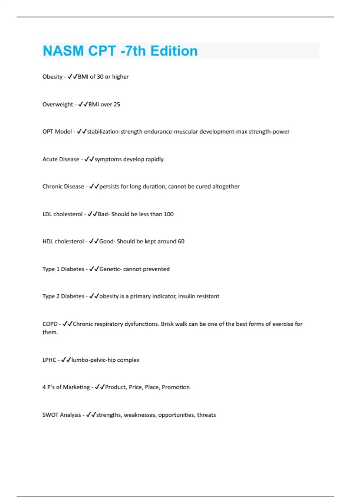 Obesity - BMI of 30 or higher Overweight - BMI over 25 OPT Model - stabilization-strength endurance-muscular development-max strength-power Acute Disease - symptoms develop rapidly Chronic Disease - persists for long duration, cannot be cured altogether LDL cholesterol - Bad- Should be less than 100 HDL cholesterol - Good- Should be kept around 60 Type 1 Diabetes - Genetic- cannot prevented Type 2 Diabetes - obesity is a primary indicator, insulin resistant COPD - Chronic respiratory dysfunctions. Brisk walk can be one of the best forms of exercise for them. LPHC - lumbo-pelvic-hip complex 4 P's of Marketing - Product, Price, Place, Promotion SWOT Analysis - strengths, weaknesses, opportunities, threats