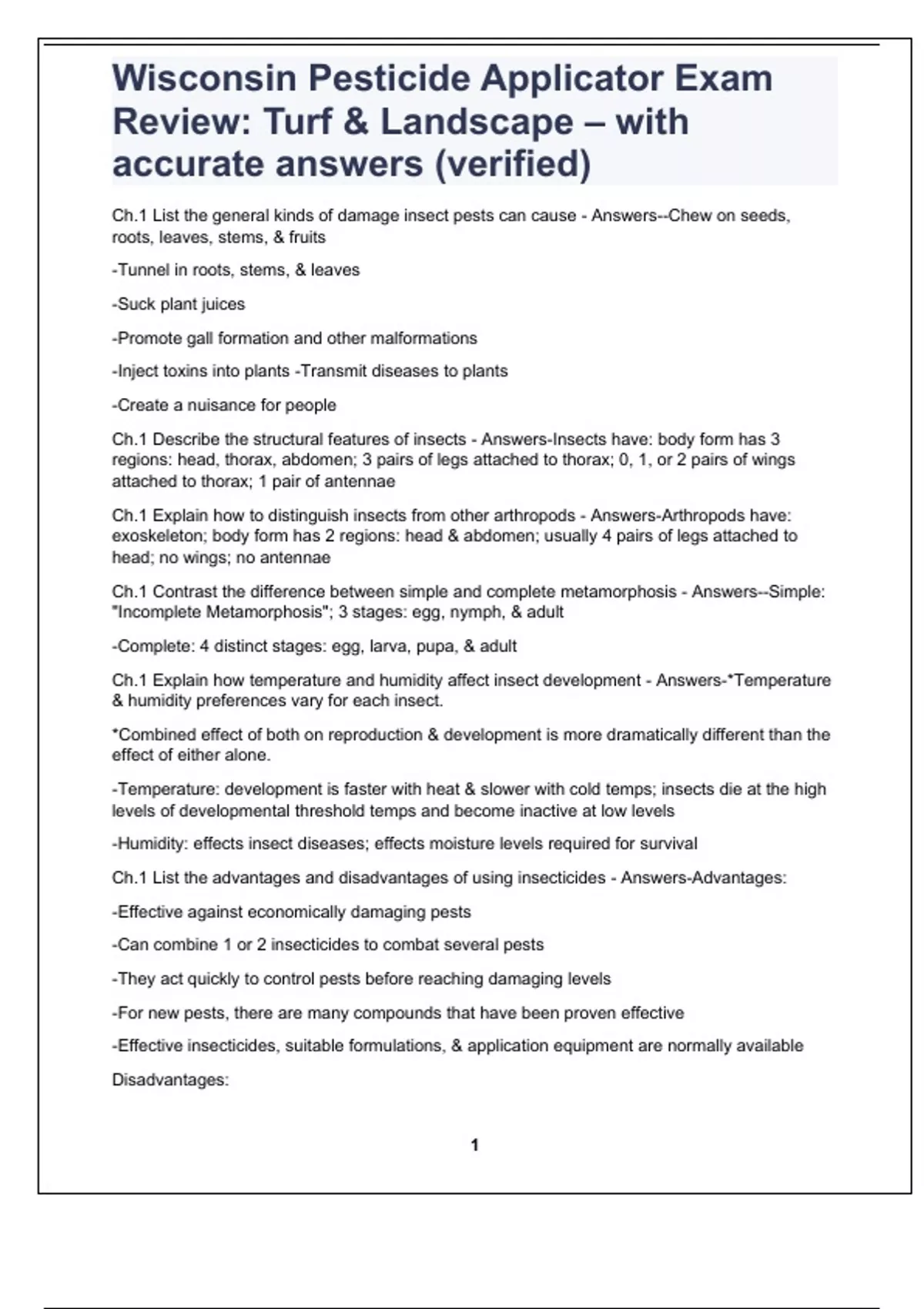 Ch.1 List the general kinds of damage insect pests can cause - Answers--Chew on seeds, roots, leaves, stems, & fruits -Tunnel in roots, stems, & leaves -Suck plant juices -Promote gall formation and other malformations -Inject toxins into plants -Transmit diseases to plants -Create a nuisance for people Ch.1 Describe the structural features of insects - Answers-Insects have: body form has 3 regions: head, thorax, abdomen; 3 pairs of legs attached to thorax; 0, 1, or 2 pairs of wings attached to thorax; 1 pair of antennae Ch.1 Explain how to distinguish insects from other arthropods - Answers-Arthropods have: exoskeleton; body form has 2 regions: head & abdomen; usually 4 pairs of legs attached to head; no wings; no antennae Ch.1 Contrast the difference between simple and complete metamorphosis - Answers--Simple: "Incomplete Metamorphosis"; 3 stages: egg, nymph, & adult -Complete: 4 distinct stages: egg, larva, pupa, & adult Ch.1 Explain how temperature and humidity affect insect development - Answers-*Temperature & humidity preferences vary for each insect. *Combined effect of both on reproduction & development is more dramatically different than the effect of either alone. -Temperature: development is faster with heat & slower with cold temps; insects die at the high levels of developmental threshold temps and become inactive at low levels -Humidity: effects insect diseases; effects moisture levels required for survival Ch.1 List the advantages and disadvantages of using insecticides - Answers-Advantages: -Effective against economically damaging pests -Can combine 1 or 2 insecticides to combat several pests -They act quickly to control pests before reaching damaging levels -For new pests, there are many compounds that have been proven effective -Effective insecticides, suitable formulations, & application equipment are normally available Disadvantages:
