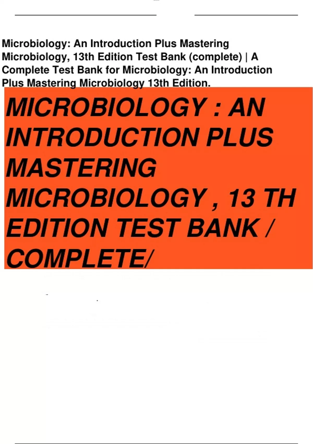 Microbiology: An Introduction Plus Mastering Microbiology, 13th Edition Test Bank (complete) | A Complete Test Bank for Microbiology: An Introduction Plus Mastering Microbiology 13th Edition. MICROBIOLOGY : AN INTRODUCTION PLUS MASTERING MICROBIOLOGY , 1