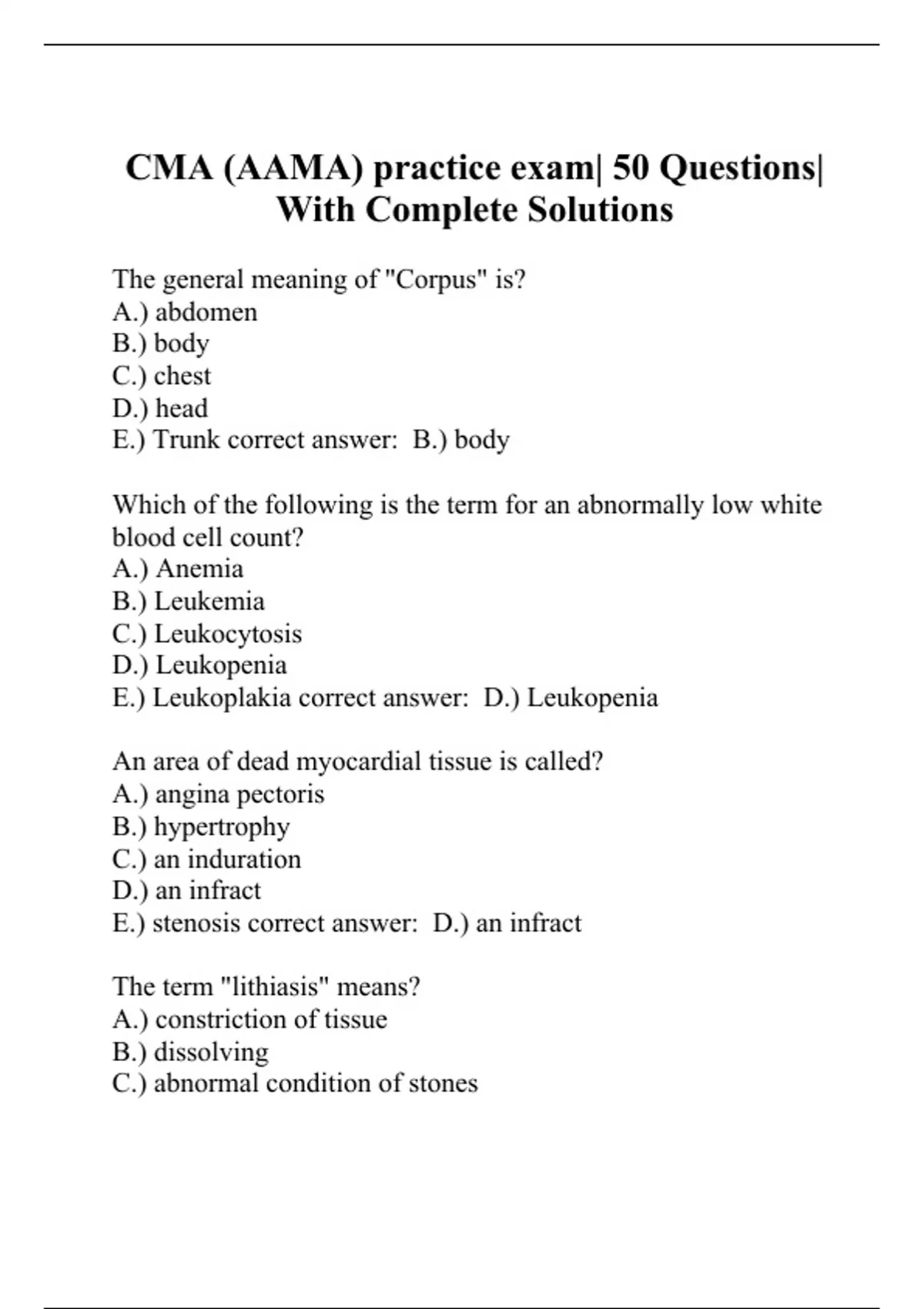 The general meaning of "Corpus" is? A.) abdomen B.) body C.) chest D.) head E.) Trunk correct answer: B.) body Which of the following is the term for an abnormally low white blood cell count? A.) Anemia B.) Leukemia C.) Leukocytosis D.) Leukopenia E.) Leukoplakia correct answer: D.) Leukopenia An area of dead myocardial tissue is called? A.) angina pectoris B.) hypertrophy C.) an induration D.) an infract E.) stenosis correct answer: D.) an infract The term "lithiasis" means? A.) constriction of tissue B.) dissolving C.) abnormal condition of stones D.) penetrating a cavity E.) stretching of tissue correct answer: C.) abnormal condition of stones menarche refers to which of the following? A.) beginning of menstruation