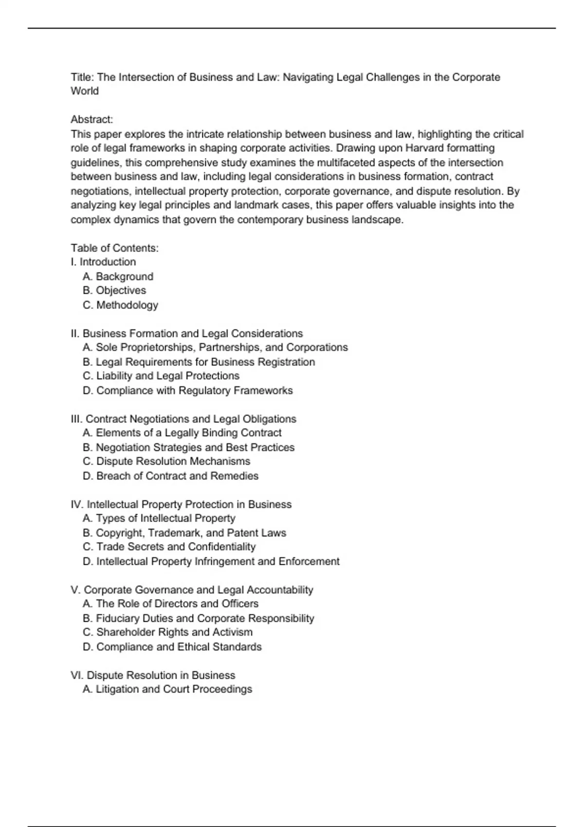 This paper explores the intricate relationship between business and law, highlighting the critical role of legal frameworks in shaping corporate activities. Drawing upon Harvard formatting guidelines, this comprehensive study examines the multifaceted aspects of the intersection between business and law, including legal considerations in business formation, contract negotiations, intellectual property protection, corporate governance, and dispute resolution. By analyzing key legal principles and landmark cases, this paper offers valuable insights into the complex dynamics that govern the contemporary business landscape.