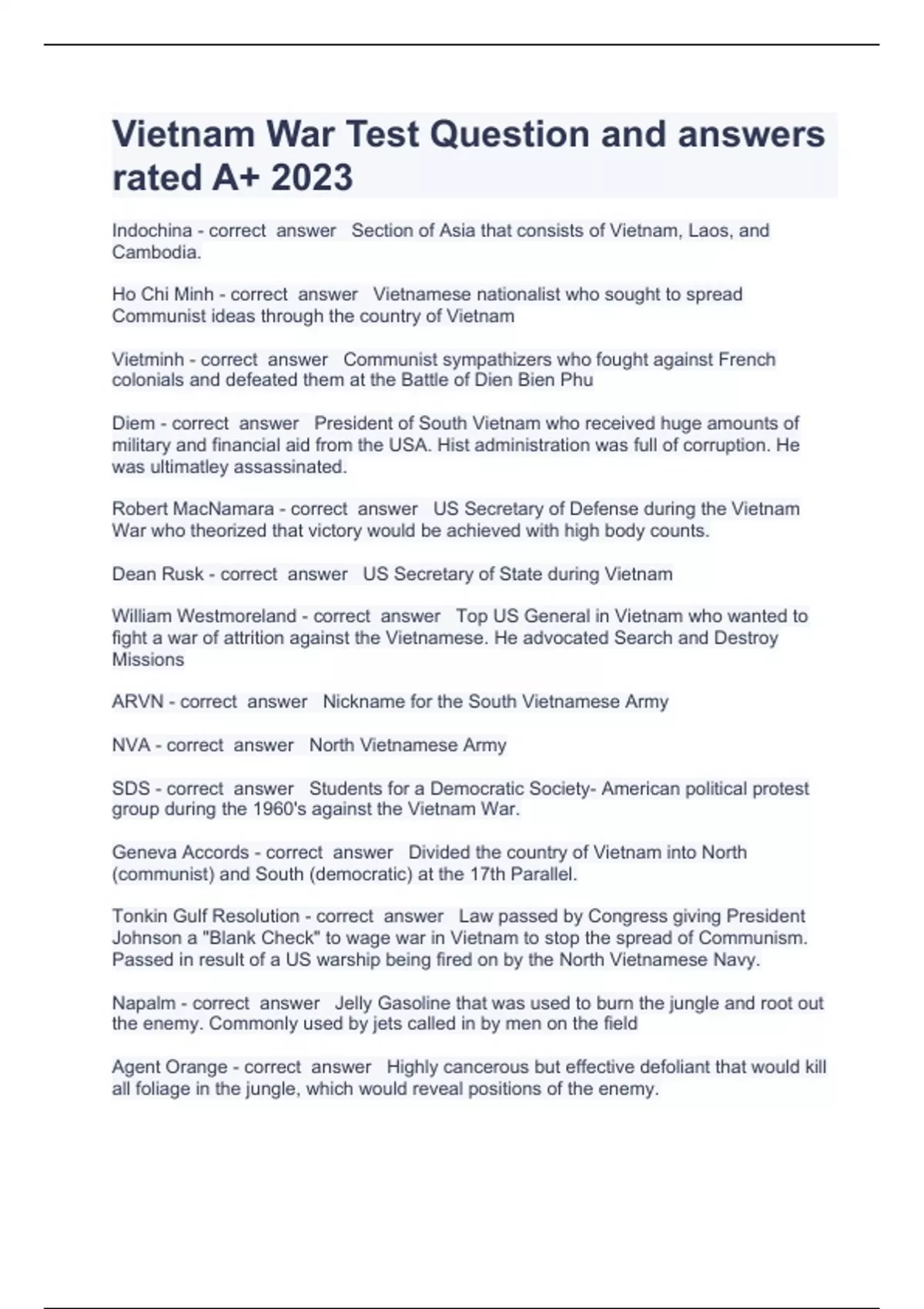 Vietnam War Test Question and answers rated A+ 2023 Indochina - correct answer Section of Asia that consists of Vietnam, Laos, and Cambodia. Ho Chi Minh - correct answer Vietnamese nationalist who sought to spread Communist ideas through the country of Vietnam Vietminh - correct answer Communist sympathizers who fought against French colonials and defeated them at the Battle of Dien Bien Phu Diem - correct answer President of South Vietnam who received huge amounts of military and financial aid from the USA. Hist administration was full of corruption. He was ultimatley assassinated. Robert MacNamara - correct answer US Secretary of Defense during the Vietnam War who theorized that victory would be achieved with high body counts. Dean Rusk - correct answer US Secretary of State during Vietnam