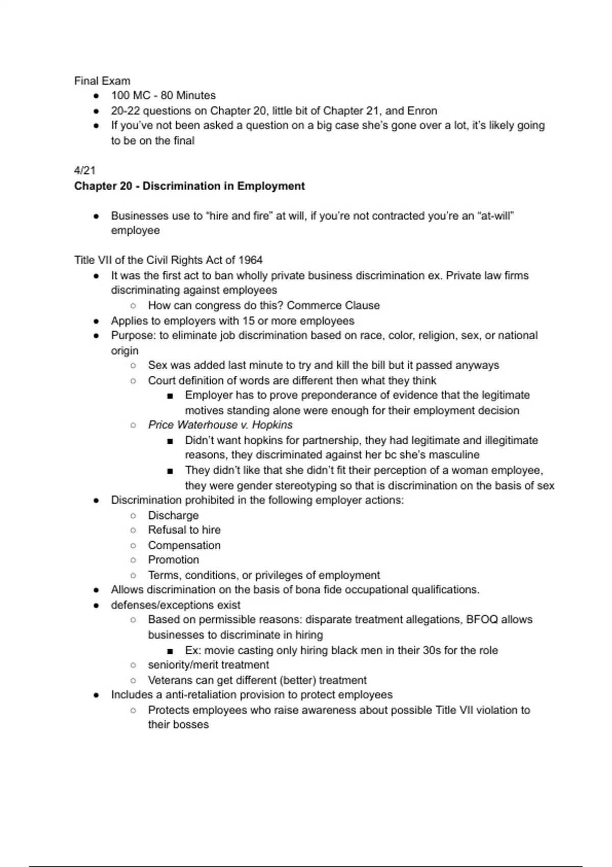 LEGL 2700 Unit 4 Notes, includes a final exam study guide summary at the end of topics she listed on our final review day of what to review for the exam. Also included dates on the notes. Disclaimer: Does not contain test material/questions, just the review information that she verbalized to us in class about the final.