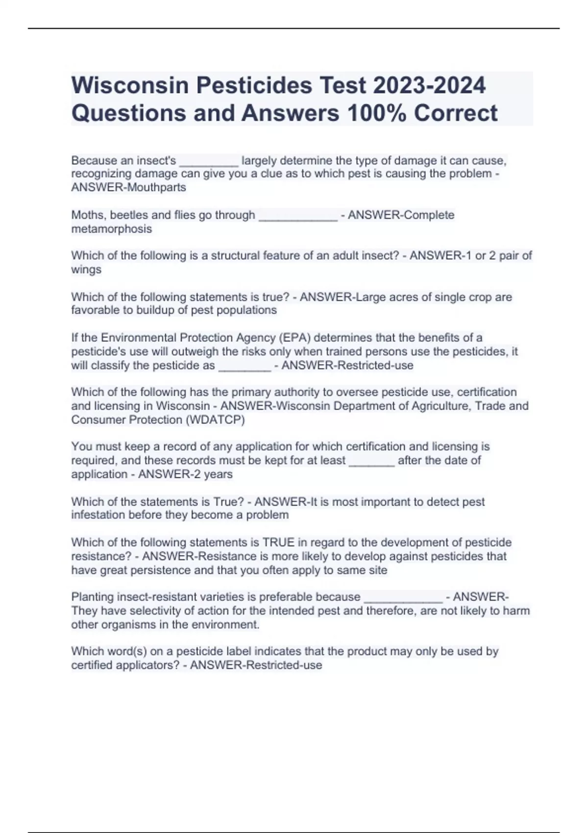 Wisconsin Pesticides Test Questions and Answers 100% CorrectWisconsin Pesticides Test Questions and Answers 100% CorrectWisconsin Pesticides Test Questions and Answers 100% CorrectWisconsin Pesticides Test Questions and Answers 100% CorrectWisconsin Pesticides Test Questions and Answers 100% Correct Because an insect's _________ largely determine the type of damage it can cause, recognizing damage can give you a clue as to which pest is causing the problem - ANSWER-Mouthparts Moths, beetles and flies go through ____________ - ANSWER-Complete metamorphosis Which of the following is a structural feature of an adult insect? - ANSWER-1 or 2 pair of wings Which of the following statements is true? - ANSWER-Large acres of single crop are favorable to buildup of pest populations If the Environmental Protection Agency (EPA) determines that the benefits of a pesticide's use will outweigh the risks only when trained persons use the pesticides, it will classify the pesticide as ________ - ANSWER-Restricted-use Which of the following has the primary authority to oversee pesticide use, certification and licensing in Wisconsin - ANSWER-Wisconsin Department of Agriculture, Trade and Consumer Protection (WDATCP) You must keep a record of any application for which certification and licensing is required, and these records must be kept for at least _______ after the date of application - ANSWER-2 years Which of the statements is True? - ANSWER-It is most important to detect pest infestation before they become a problem
