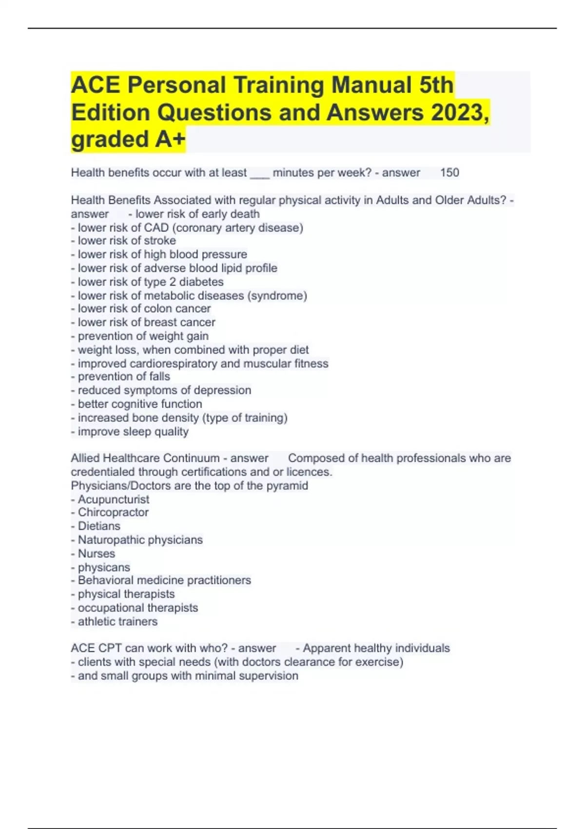 ACE Personal Training Manual 5th Edition Questions and Answers 2023, graded A+ Health benefits occur with at least ___ minutes per week? 150 Health Benefits Associated with regular physical activity in Adults and Older Adults? - lower risk of early death - lower risk of CAD (coronary artery disease) - lower risk of stroke - lower risk of high blood pressure - lower risk of adverse blood lipid profile - lower risk of type 2 diabetes - lower risk of metabolic diseases (syndrome) - lower risk of colon cancer - lower risk of breast cancer - prevention of weight gain - weight loss, when combined with proper diet - improved cardiorespiratory and muscular fitness - prevention of falls - reduced symptoms of depression - better cognitive function - increased bone density (type of training) - improve sleep quality Allied Healthcare Continuum Composed of health professionals who are credentialed through certifications and or licences. Physicians/Doctors are the top of the pyramid - Acupuncturist - Chircopractor - Dietians - Naturopathic physicians - Nurses - physicans - Behavioral medicine practitioners - physical therapists - occupational therapists - athletic trainers ACE CPT can work with who? - Apparent healthy individuals - clients with special needs (with doctors clearance for exercise) - and small groups with minimal supervision Personal trainers job make safe effective exercise-programming decisions in a variety of practical situations, while minimizing client risk and exposure to harm (e.g. physical, emotional, psychological, financial or other harm) Scope of practice legal range of services that professional can provide, the setting in which those services can be provided and the guidelines or parameters that must be followed study time for test 3-4 months certification purpose? protect public from harm ACE code of ethics? governs ethical and professional conduct Certification Valid for? 2 years To Keep Certification? - 20 hours of C.EC - CPR certification (cardiopulmonary resuscitation) - AED certification (Automated external Defibrillator) grace period after expiration? 6 months what percent of adults meet both aerobic and muscle strengthening guidelines? 20% job of a personal trainer (adherence)? increasing the likelihood that people will adhere to a program once they have started Adults should engage in how many minutes per week of physical activity ? 75 minutes of vigorous or 150 minutes of moderate Muscle strengthening activities per week? moderate to high intensity and involve every major muscle group 2 or more days per week 50% of people who start a program? will drop it within 6 months Assertivness honest straightforward expression of one's thoughts and feelings and beliefs self regulators? effective at self regulation - time - priorities - schedules - behaviours Factors affecting adherence? - personal attributes - environmental attributes - physical-activity attributes Personal attributes? - demographic variables (gender/age) - health status (illness/disease) - activity history - physiological traits (self-efficacy) - knowledge attitudes and beliefs (locus of control = belief that they have control over their health outcomes) (perceived barriers = lack of time) Environmental factors - access to facilities (no gyms close by) - time - social support (family and friends) physical activity factors - intensity (vigorous intensity workouts high dropout rate) - injury (sore back) Leadership - professionalism - trust - listen to client - excitement in their craft - innovate and educated - interested in their progress Role clairty - expectations no clearly defined - clarify your role clearly - responsibilities and roles Goal setting? - avoid too many goals - avoid negative goals - set short and long term - process and performance goals - revisit goals regularly Stages of client trainer relationship? 1. rapport 2. investigation 3. planning 4. action rapport? - first time meeting - relationship and trust - first impressions (important) investigation? - review clients health and fitness data - any available tests - medical clearance info - clients goals and exercise history - good listening skills Planning? - designs exercise plan in partnership with client - generating discussions and alternatives - formulating a plan - evaluate the exercise program - ready to begin working out Action? - ability to teach new motor skills - setting up self-motivating systems - Individualizing teaching techniques Verbal and nonverbal communication? - voice quality - eye contact - facial expression - hand gestures - body position Listening skills - encouraging (I know what you mean) - paraphrasing (demonstrate understanding) - questioning (open ended questions) - reflecting (understanding or seek clarification) - summarizing (confirm accuracy) response to difficult disclosures? short concise "im so sorry" Process goals? something a client does - completing a certain number of workouts per week product goals? is something achieved - weight loss achieved - or resistance (weight) achieved Motivational interviewing? a method of speaking with people in a way that motivates them make a decision or change a behaviour - ask probing questions - listen effectively - provide educational info - keep convo friendly - build self confidence - encourage clients to generate ideas learning styles 1. visual 2. auditory 3. kinesthetic (tactile) tell show do method? tell them, show them, have them do it - motor learning - remind them takes time to improve motor skills - introduce new skills slowly - allow for focused practice Feedback - start with what was done well - then correct errors - motivate clients to continue practicing and improving Cultural competence? working with people of various backgrounds Stages of learning? 1. Cognitive (new motor skills are being learned, movements usually uncoordinated and clumsy) 2. Associative (client begins to master basics, and are ready for more specific feedback 3. Autonomous (clients ar