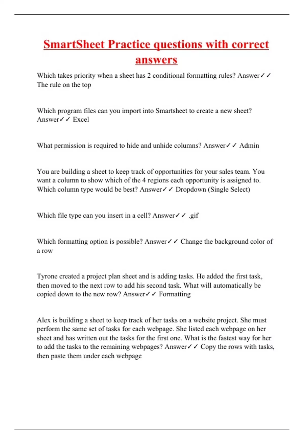 Which takes priority when a sheet has 2 conditional formatting rules? Answer The rule on the top Which program files can you import into Smartsheet to create a new sheet? Answer Excel What permission is required to hide and unhide columns? Answer Admin You are building a sheet to keep track of opportunities for your sales team. You want a column to show which of the 4 regions each opportunity is assigned to. Which column type would be best? Answer Dropdown (Single Select) Which file type can you insert in a cell? Answer .gif Which formatting option is possible? Answer Change the background color of a row Tyrone created a project plan sheet and is adding tasks. He added the first task, then moved to the next row to add his second task. What will automatically be copied down to the new row? Answer Formatting