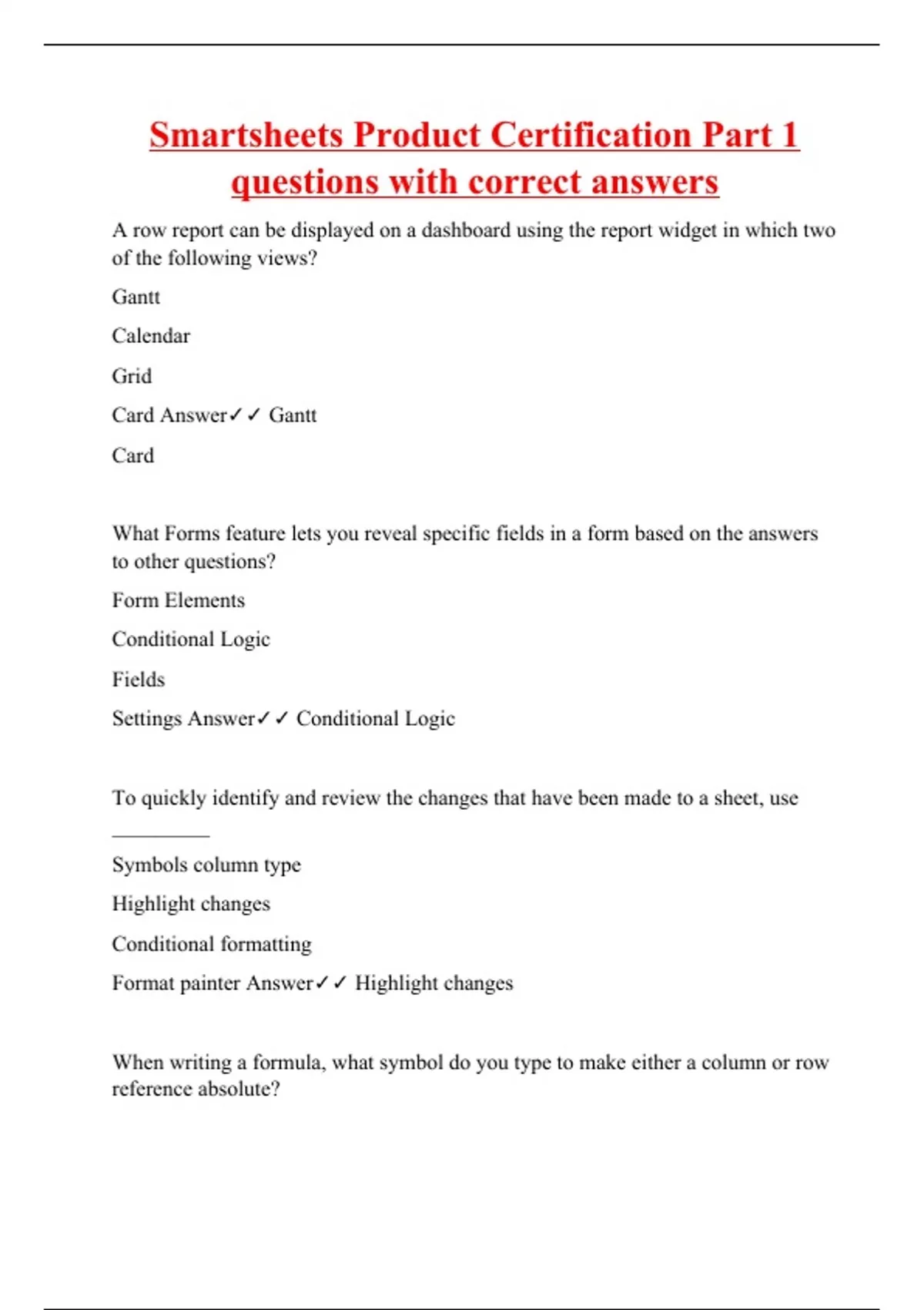 A row report can be displayed on a dashboard using the report widget in which two of the following views? Gantt Calendar Grid Card Answer Gantt Card What Forms feature lets you reveal specific fields in a form based on the answers to other questions? Form Elements Conditional Logic Fields Settings Answer Conditional Logic To quickly identify and review the changes that have been made to a sheet, use _________ Symbols column type Highlight changes Conditional formatting Format painter Answer Highlight changes When writing a formula, what symbol do you