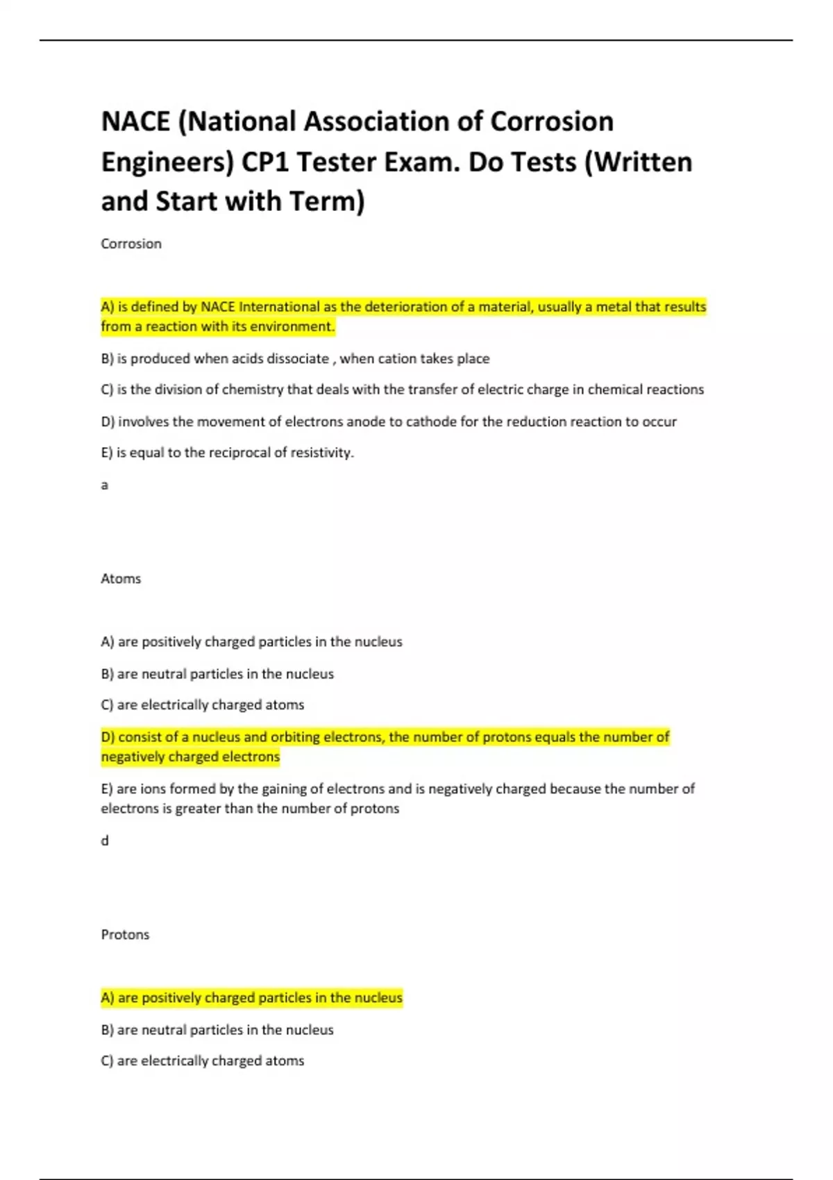 Corrosion A) is defined by NACE International as the deterioration of a material, usually a metal that results from a reaction with its environment. B) is produced when acids dissociate , when cation takes place C) is the division of chemistry that deals with the transfer of electric charge in chemical reactions D) involves the movement of electrons anode to cathode for the reduction reaction to occur E) is equal to the reciprocal of resistivity. a Atoms A) are positively charged particles in the nucleus B) are neutral particles in the nucleus C) are electrically charged atoms D) consist of a nucleus and orbiting electrons, the number of protons equals the number of negatively charged electrons E) are ions formed by the gaining of electrons and is negatively charged because the number of electrons is greater than the number of protons d