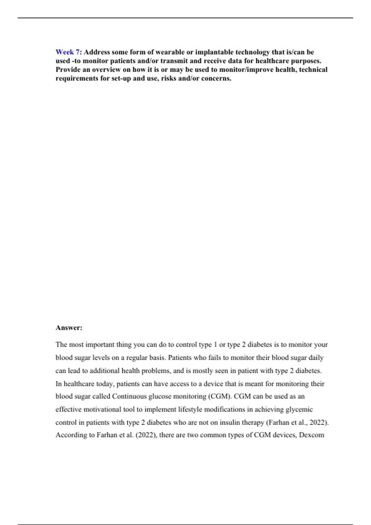 Week 7: Address some form of wearable or implantable technology that is/can be used -tomonitor patientsand/or transmit andreceivedatafor healthcarepurposes. Providean overviewon how it is or may be used to monitor/improve health, technical requirements for set-up and use,risksand/orconcerns.