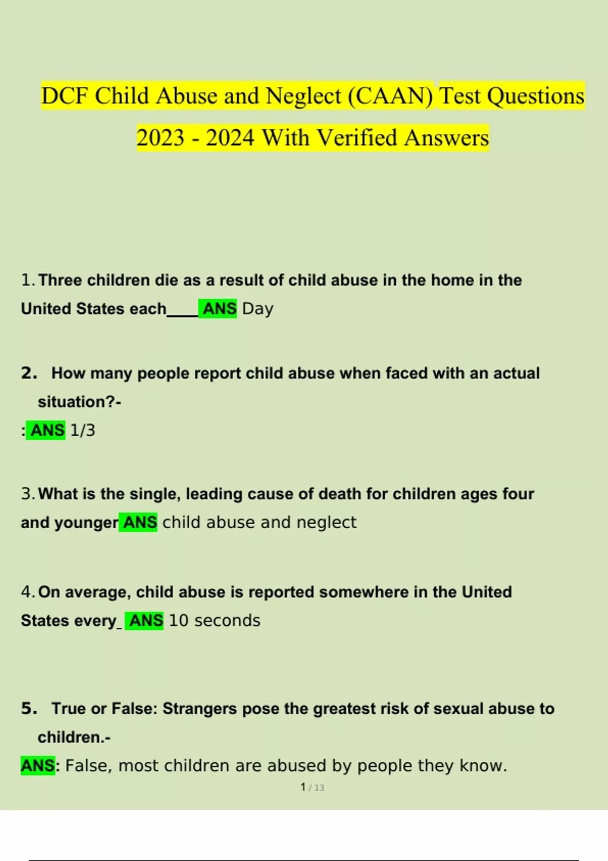 DCF Child Abuse and Neglect (CAAN) Test Questions With Verified Answers