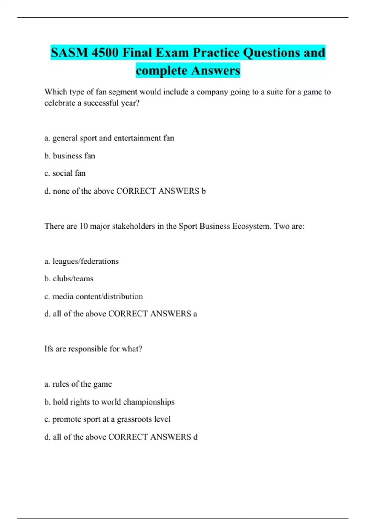 SASM 4500 Final Exam Practice Questions and complete Answers Which type of fan segment would include a company going to a suite for a game to celebrate a successful year? There are 10 major stakeholders in the Sport Business Ecosystem. Two are: Ifs are responsible for what? Which of the following factors is becoming the most important reason why schools join/ leave conferences? Given that the decision makers in the sport industry operate in a broad ecosystem, decisions made by one stakeholder group will impact ___? Athlete health and welfare in professional sport is the responsibility of: