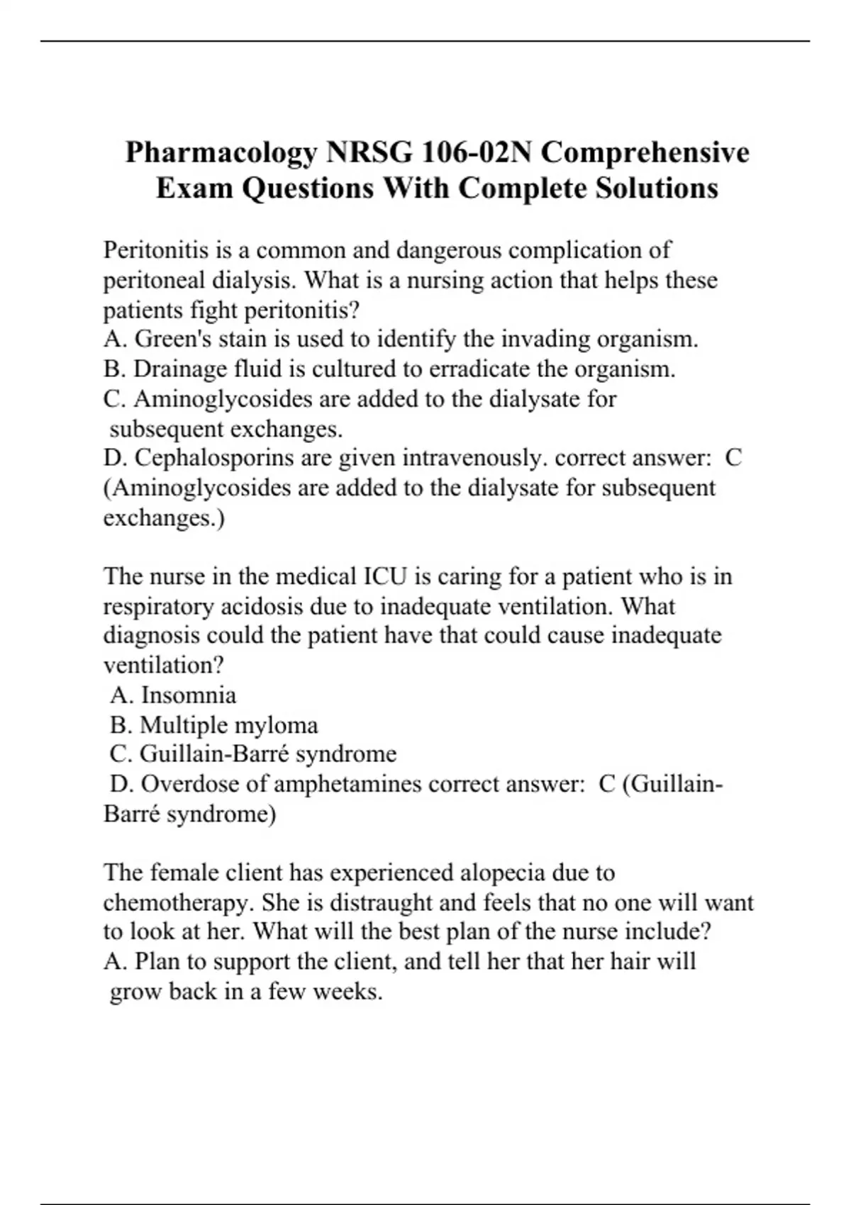 Peritonitis is a common and dangerous complication of peritoneal dialysis. What is a nursing action that helps these patients fight peritonitis? A. Green's stain is used to identify the invading organism. B. Drainage fluid is cultured to erradicate the organism. C. Aminoglycosides are added to the dialysate for subsequent exchanges. D. Cephalosporins are given intravenously. correct answer: C (Aminoglycosides are added to the dialysate for subsequent exchanges.) The nurse in the medical ICU is caring for a patient who is in respiratory acidosis due to inadequate ventilation. What diagnosis could the patient have that could cause inadequate ventilation? A. Insomnia B. Multiple myloma C. Guillain-Barré syndrome D. Overdose of amphetamines correct answer: C (Guillain-Barré syndrome) The female client has experienced alopecia due to chemotherapy. She is distraught and feels that no one will want to look at her. What will the best plan of the nurse include? A. Plan to support the client, and tell her that her hair will grow back in a few weeks. B. Plan to have a cancer survivor visit th