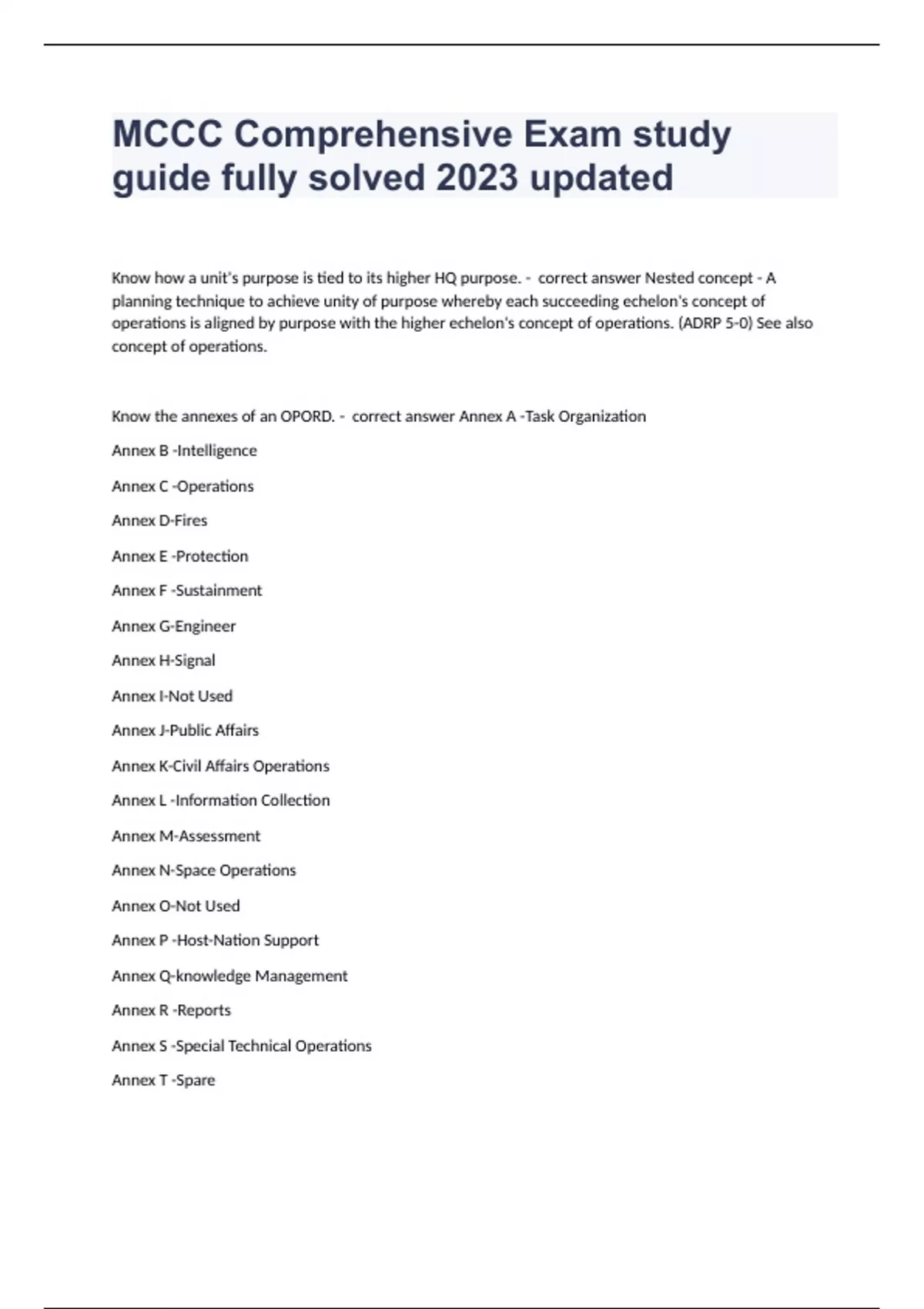 MCCC Comprehensive Exam study guide fully solved 2023 updatedKnow how a unit's purpose is tied to its higher HQ purpose. - correct answer Nested concept - A planning technique to achieve unity of purpose whereby each succeeding echelon's concept of operations is aligned by purpose with the higher echelon's concept of operations. (ADRP 5-0) See also concept of operations. Know the annexes of an OPORD. - correct answer Annex A -Task Organization Annex B -Intelligence Annex C -Operations Annex D-Fires Annex E -Protection Annex F -Sustainment Annex G-Engineer Annex H-Signal Annex I-Not Used Annex J-Public Affairs Annex K-Civil Affairs Operations Annex L -Information Collection Annex M-Assessment Annex N-Space Operations Annex O-Not Used Annex P -Host-Nation Support Annex Q-knowledge Management Annex R -Reports Annex S -Special Technical Operations Annex T -Spare Annex U-Inspector General Annex V-Interagency Coordination Annex W-Operational Contract Support Annex X-Spare Annex Y-Spare Annex Z -Distribution FM 6-0 Command and control - correct answer this warfighting function is the related tasks and a system that enable commanders to synchronize and converge all elements of combat power. Movement and maneuver - correct answer this warfighting function is the related tasks and systems that move and employ forces to achieve a position of relative advantage over the enemy and other threats. Intelligence - correct answer this warfighting function is the related tasks and systems that facilitate understanding the enemy, terrain, weather, civil considerations, and other significant aspects of the operational environment. Fires - correct answer this warfighting function is the related tasks and systems that create and converge effects in all domains against the adversary or enemy to enable operations across the range of military operations. Sustainment - correct answer this warfighting function is the related tasks and systems that provide support and services to ensure freedom of action, extended operational reach, and prolong endurance. Protection - correct answer This warfighting function is the related tasks and systems that preserve the force so the commander can apply maximum combat power to accomplish the mission. ADP 3-0 Know the steps and sub-steps of the TLPs. - correct answer 1. Receive Mission 2. Issue warning order 3. Make tentative plan a. METT-TC b. COA Dev