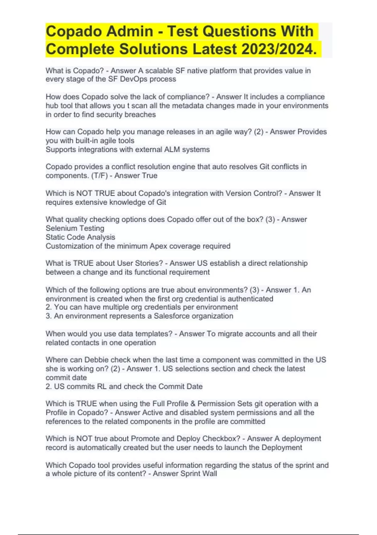 Copado Admin - Test Questions With Complete Solutions Latest 2023/2024. What is Copado? - Answer A scalable SF native platform that provides value in every stage of the SF DevOps process How does Copado solve the lack of compliance? - Answer It includes a compliance hub tool that allows you t scan all the metadata changes made in your environments in order to find security breaches How can Copado help you manage releases in an agile way? (2) - Answer Provides you with built-in agile tools Supports integrations with external ALM systems Copado provides a conflict resolution engine that auto resolves Git conflicts in components. (T/F) - Answer True Which is NOT TRUE about Copado's integration with Version Control? - Answer It requires extensive knowledge of Git What quality checking options does Copado offer out of the box? (3) - Answer Selenium Testing Static Code Analysis Customization of the minimum Apex coverage required What is TRUE about User Stories? - Answer US establish a direct relationship between a change and its functional requirement Which of the following options are true about environments? (3) - Answer 1. An environment is created when the first org credential is authenticated 2. You can have multiple org credentials per environment 3. An environment represents a Salesforce organization When would you use data templates? - Answer To migrate accounts and all their related contacts in one operation Where can Debbie check when the last time a component was committed in the US she is working on? (2) - Answer 1. US selections section and check the latest commit date 2. US commits RL and check the Commit Date Which is TRUE when using the Full Profile & Permission Sets git operation with a Profile in Copado? - Answer Active and disabled system permissions and all the references to the related components in the profile are committed Which is NOT true about Promote and Deploy Checkbox? - Answer A deployment record is automatically created but the user needs to launch the Deployment Which Copado tool provides useful information regarding the status of the sprint and a whole picture of its content? - Answer Sprint Wall Dave made some changes to an Apex class in Dev1, but when he clicks Commit Changes the Apex class metadata type isn't available in the metadata grid. What should he check? - Answer He must check the Advanced Metadata filter section in the Org Credential record to see if there are any restricted metadata types Why would you flag an object as Retrieve Only when committing changes on a US? - Answer You just want to update FLS