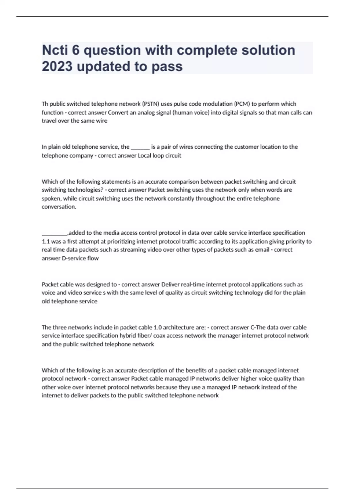 Ncti 6 question with complete solution 2023 updated to passTh public switched telephone network (PSTN) uses pulse code modulation (PCM) to perform which function - correct answer Convert an analog signal (human voice) into digital signals so that man calls can travel over the same wire In plain old telephone service, the ______ is a pair of wires connecting the customer location to the telephone company - correct answer Local loop circuit Which of the following statements is an accurate comparison between packet switching and circuit switching technologies? - correct answer Packet switching uses the network only when words are spoken, while circuit switching uses the network constantly throughout the entire telephone conversation. ________,added to the media access control protocol in data over cable service interface specification 1.1 was a first attempt at prioritizing internet protocol traffic according to its application giving priority to real time data packets such as streaming video over other types of packets such as email - correct answer D-service flow Packet cable was designed to - correct answer Deliver real-time internet protocol applications such as voice and video service s with the same level of quality as circuit switching technology did for the plain old telephone service The three networks include in packet cable 1.0 architecture are: - correct answer C-The data over cable service interface specification hybrid fiber/ coax access network the manager internet protocol network and the public switched telephone network Which of the following is an accurate description of the benefits of a packet cable managed internet protocol network - correct answer Packet cable managed IP networks deliver higher voice quality than other voice over internet protocol networks because they use a managed IP network instead of the internet to deliver packets to the public switched telephone network