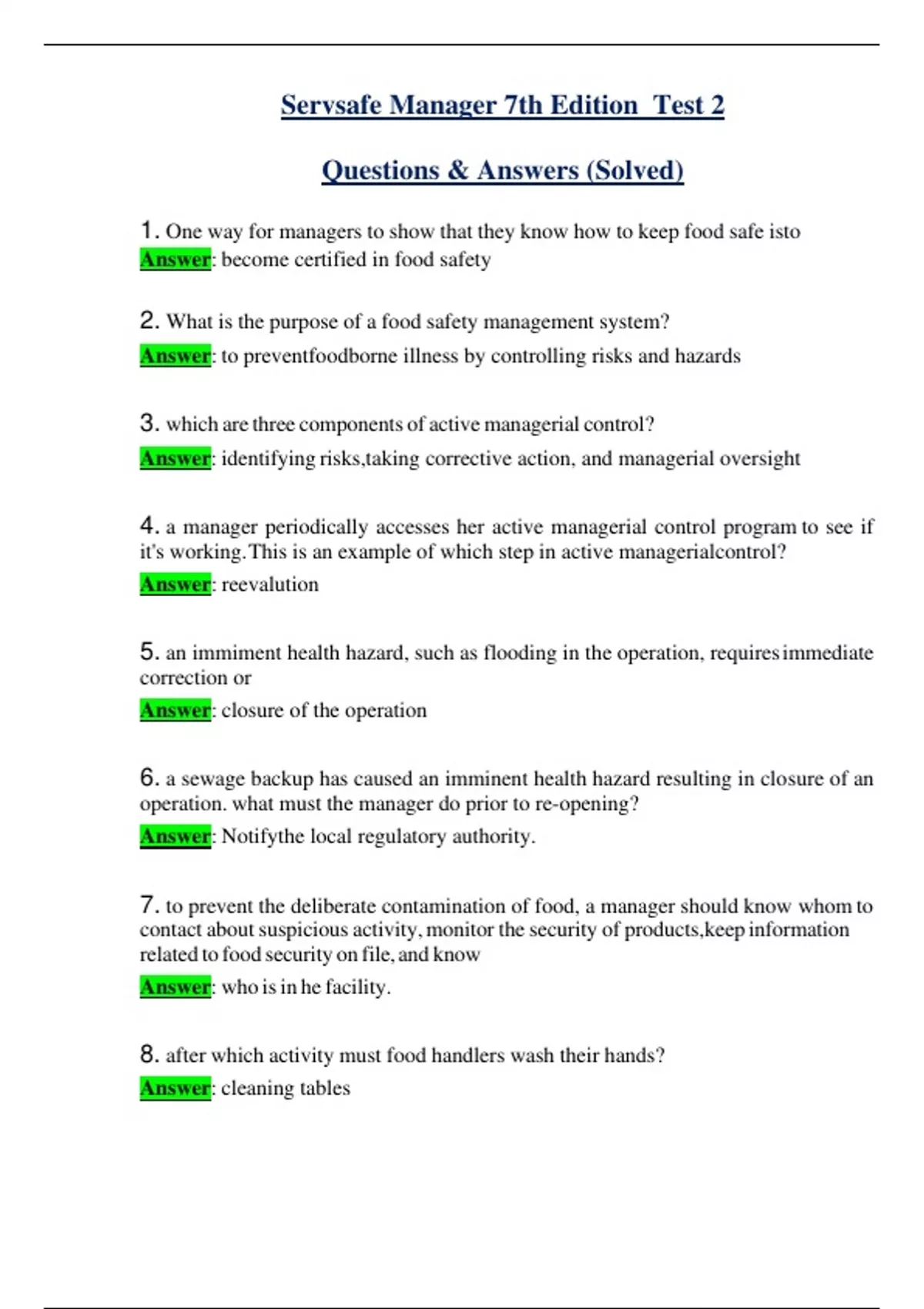 Servsafe Manager 7th Edition Test 2 Questions & Answers (Solved) 1. One way for managers to show that they know how to keep food safe isto Answer: become certified in food safety 2. What is the purpose of a food safety management system? Answer: to preventfoodborne illness by controlling risks and hazards 3. which are three components of active managerial control? Answer: identifying risks,taking corrective action, and managerial oversight 4. a manager periodically accesses her active managerial control program to see if it's working.This is an example of which step in active managerialcontrol? Answer: reevalution 5. an immiment health hazard, such as flooding in the operation, requiresimmediate correction or Answer: closure of the operation 6. a sewage backup has caused an imminent health hazard resulting in closure of an operation. what must the manager do prior to re-opening? Answer: Notifythe local regulatory authority. 7. to prevent the deliberate contamination of food, a manager should know whom to contact aboutsuspicious activity,monitor the security of products,keep information related to food security on file, and know Answer: who isin he facility. 8. after which activity must food handlers wash their hands? Answer: cleaning tables