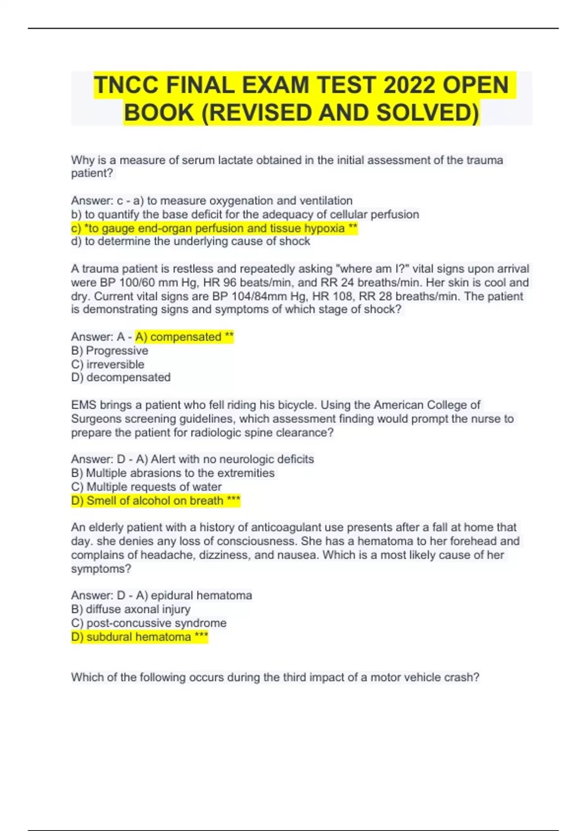 TNCC FINAL EXAM TEST 2024 OPEN BOOK (REVISED AND SOLVED) Why is a measure of serum lactate obtained in the initial assessment of the trauma patient? Answer: c - a) to measure oxygenation and ventilation b) to quantify the base deficit for the adequacy of cellular perfusion c) *to gauge end-organ perfusion and tissue hypoxia ** d) to determine the underlying cause of shock A trauma patient is restless and repeatedly asking "where am I?" vital signs upon arrival were BP 100/60 mm Hg, HR 96 beats/min, and RR 24 breaths/min. Her skin is cool and dry. Current vital signs are BP 104/84mm Hg, HR 108, RR 28 breaths/min. The patient is demonstrating signs and symptoms of which stage of shock? Answer: A - A) compensated ** B) Progressive C) irreversible D) decompensated EMS brings a patient who fell riding his bicycle. Using the American College of Surgeons screening guidelines, which assessment finding would prompt the nurse to prepare the patient for radiologic spine clearance? Answer: D - A) Alert with no neurologic deficits B) Multiple abrasions to the extremities C) Multiple requests of water D) Smell of alcohol on breath *** An elderly patient with a history of anticoagulant use presents after a fall at home that day. she denies any loss of consciousness. She has a hematoma to her forehead and complains of headache, dizziness, and nausea. Which is a most likely cause of her symptoms? Answer: D - A) epidural hematoma B) diffuse axonal injury C) post-concussive syndrome D) subdural hematoma ***