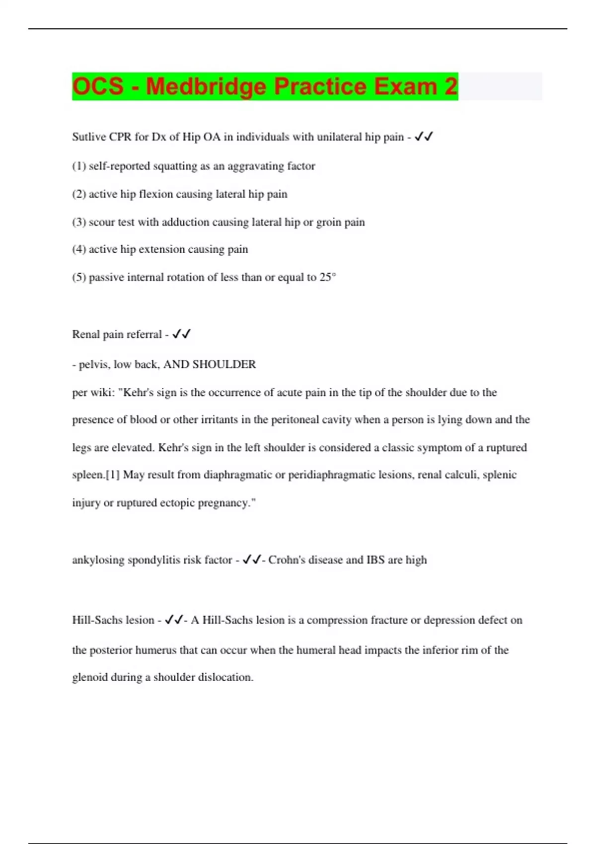 Sutlive CPR for Dx of Hip OA in individuals with unilateral hip pain - (1) self-reported squatting as an aggravating factor (2) active hip flexion causing lateral hip pain (3) scour test with adduction causing lateral hip or groin pain (4) active hip extension causing pain (5) passive internal rotation of less than or equal to 25° Renal pain referral - - pelvis, low back, AND SHOULDER per wiki: "Kehr's sign is the occurrence of acute pain in the tip of the shoulder due to the presence of blood or other irritants in the peritoneal cavity when a person is lying down and the legs are elevated. Kehr's sign in the left shoulder is considered a classic symptom of a ruptured spleen.[1] May result from diaphragmatic or peridiaphragmatic lesions, renal calculi, splenic injury or ruptured ectopic pregnancy." ankylosing spondylitis risk factor - - Crohn's disease and IBS are high Hill-Sachs lesion - - A Hill-Sachs lesion is a compression fracture or depression defect on the posterior humerus that can occur when the humeral head impacts the inferior rim of the glenoid during a shoulder dislocation.