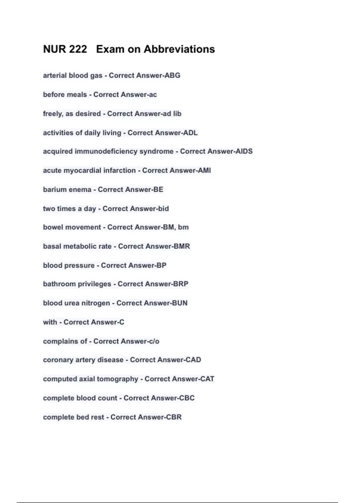 NUR 222 Exam on Abbreviations arterial blood gas - Correct Answer-ABG before meals - Correct Answer-ac freely, as desired - Correct Answer-ad lib activities of daily living - Correct Answer-ADL acquired immunodeficiency syndrome - Correct Answer-AIDS acute myocardial infarction - Correct Answer-AMI barium enema - Correct Answer-BE two times a day - Correct Answer-bid bowel movement - Correct Answer-BM, bm basal metabolic rate - Correct Answer-BMR blood pressure - Correct Answer-BP bathroom privileges - Correct Answer-BRP blood urea nitrogen - Correct Answer-BUN with - Correct Answer-C complains of - Correct Answer-c/o coronary artery disease - Correct Answer-CAD computed axial tomography - Correct Answer-CAT complete blood count - Correct Answer-CBC complete bed rest - Correct Answer-CBR