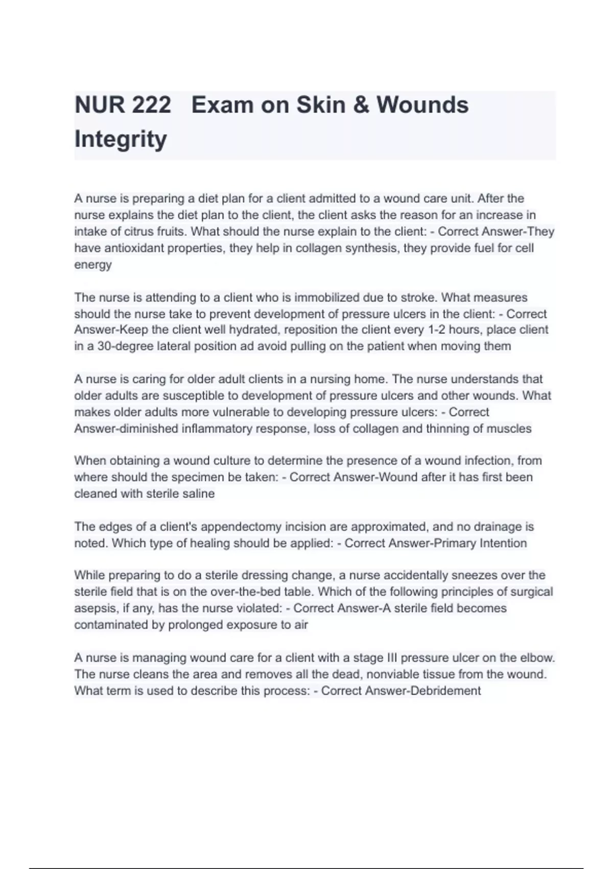 NUR 222 Exam on Skin & Wounds Integrity A nurse is preparing a diet plan for a client admitted to a wound care unit. After the nurse explains the diet plan to the client, the client asks the reason for an increase in intake of citrus fruits. What should the nurse explain to the client: - Correct Answer-They have antioxidant properties, they help in collagen synthesis, they provide fuel for cell energy The nurse is attending to a client who is immobilized due to stroke. What measures should the nurse take to prevent development of pressure ulcers in the client: - Correct Answer-Keep the client well hydrated, reposition the client every 1-2 hours, place client in a 30-degree lateral position ad avoid pulling on the patient when moving them A nurse is caring for older adult clients in a nursing home. The nurse understands that older adults are susceptible to development of pressure ulcers and other wounds. What makes older adults more vulnerable to developing pressure ulcers: - Correct Answer-diminished inflammatory response, loss of collagen and thinning of muscles When obtaining a wound culture to determine the presence of a wound infection, from where should the specimen be taken: - Correct Answer-Wound after it has first been cleaned with sterile saline The edges of a client's appendectomy incision are approximated, and no drainage is noted. Which type of healing should be applied: - Correct Answer-Primary Intention While preparing to do a sterile dressing change, a nurse accidentally sneezes over the sterile field that is on the over-the-bed table. Which of the following principles of surgical asepsis, if any, has the nurse violated: - Correct Answer-A sterile field becomes contaminated by prolonged exposure to air A nurse is managing wound care for a client with a stage III pressure ulcer on the elbow. The nurse cleans the area and removes all the dead, nonviable tissue from the wound. What term is used to describe this process: - Correct Answer-Debridement