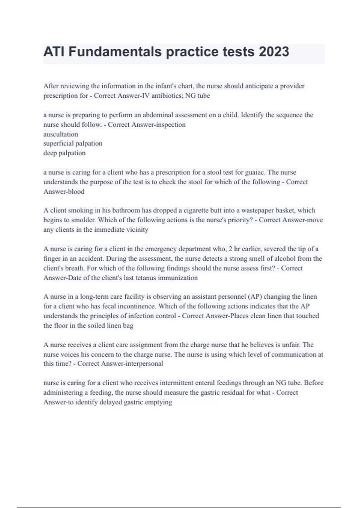 ATI Fundamentals practice tests 2023 After reviewing the information in the infant's chart, the nurse should anticipate a provider prescription for - Correct Answer-IV antibiotics; NG tube a nurse is preparing to perform an abdominal assessment on a child. Identify the sequence the nurse should follow. - Correct Answer-inspection auscultation superficial palpation deep palpation a nurse is caring for a client who has a prescription for a stool test for guaiac. The nurse understands the purpose of the test is to check the stool for which of the following - Correct Answer-blood A client smoking in his bathroom has dropped a cigarette butt into a wastepaper basket, which begins to smolder. Which of the following actions is the nurse's priority? - Correct Answer-move any clients in the immediate vicinity