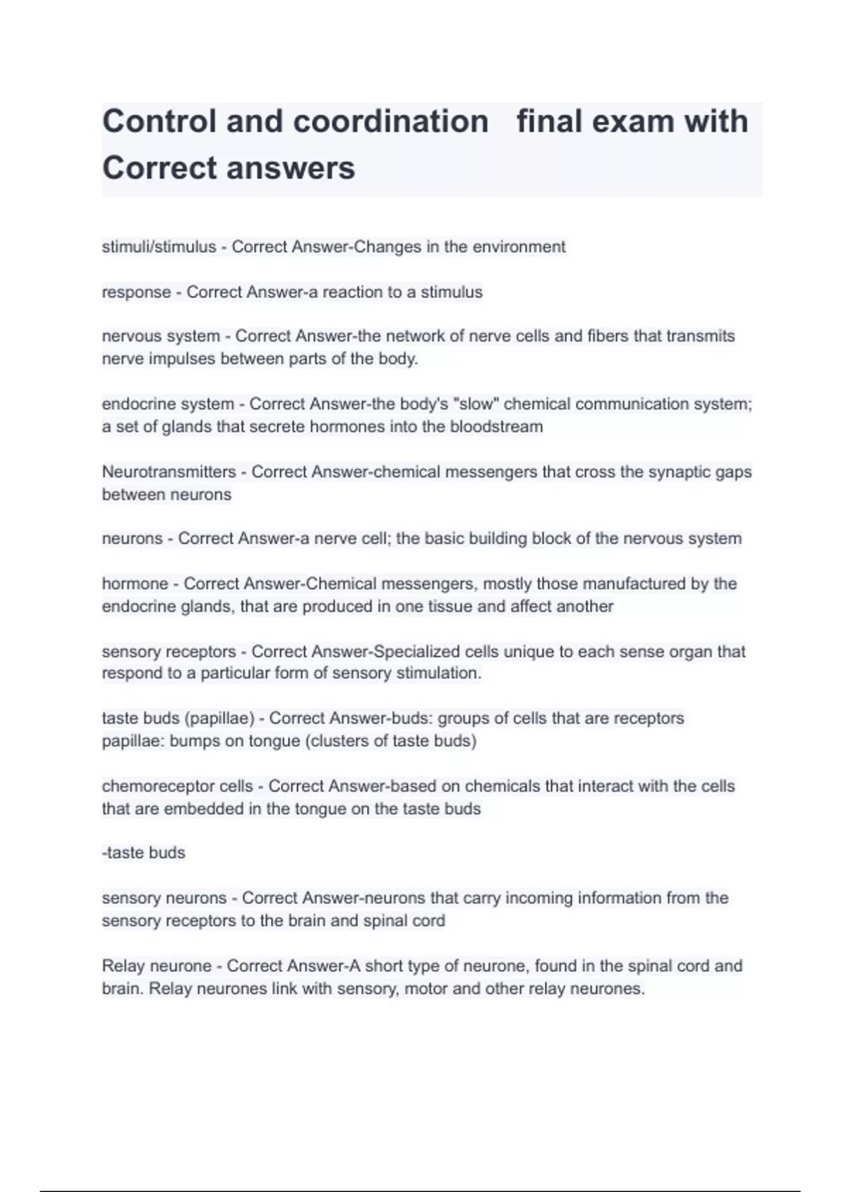 Control and coordination final exam with Correct answers stimuli/stimulus - Correct Answer-Changes in the environment response - Correct Answer-a reaction to a stimulus nervous system - Correct Answer-the network of nerve cells and fibers that transmits nerve impulses between parts of the body. endocrine system - Correct Answer-the body's "slow" chemical communication system; a set of glands that secrete hormones into the bloodstream Neurotransmitters - Correct Answer-chemical messengers that cross the synaptic gaps between neurons neurons - Correct Answer-a nerve cell; the basic building block of the nervous system hormone - Correct Answer-Chemical messengers, mostly those manufactured by the endocrine glands, that are produced in one tissue and affect another sensory receptors - Correct Answer-Specialized cells unique to each sense organ that respond to a particular form of sensory stimulation.