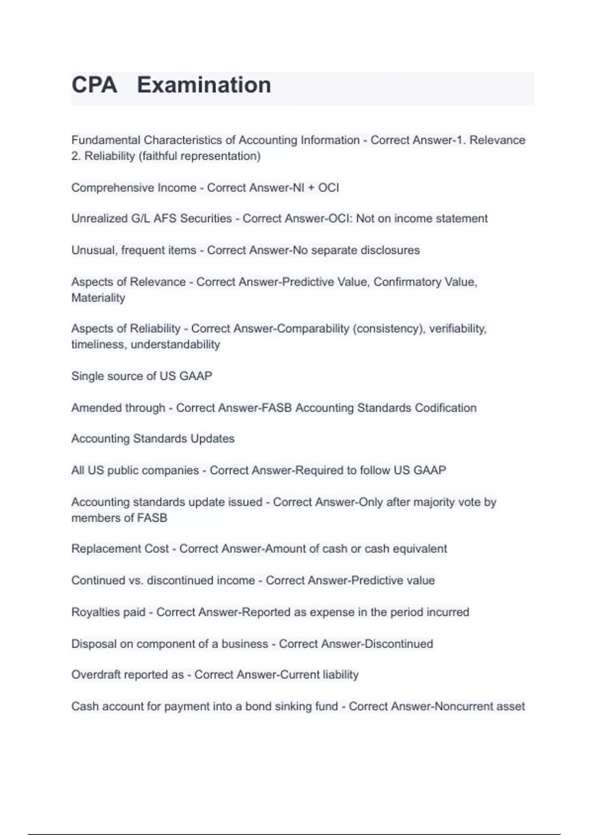 CPA Examination Fundamental Characteristics of Accounting Information - Correct Answer-1. Relevance 2. Reliability (faithful representation) Comprehensive Income - Correct Answer-NI + OCI Unrealized G/L AFS Securities - Correct Answer-OCI: Not on income statement Unusual, frequent items - Correct Answer-No separate disclosures Aspects of Relevance - Correct Answer-Predictive Value, Confirmatory Value, Materiality Aspects of Reliability - Correct Answer-Comparability (consistency), verifiability, timeliness, understandability Single source of US GAAP Amended through - Correct Answer-FASB Accounting Standards Codification Accounting Standards Updates All US public companies - Correct Answer-Required to follow US GAAP Accounting standards update issued - Correct Answer-Only after majority vote by members of FASB Replacement Cost - Correct Answer-Amount of cash or cash equivalent Continued vs. discontinued income - Correct Answer-Predictive value Royalties paid - Correct Answer-Reported as expense in the period incurred Disposal on component of a business - Correct Answer-Discontinued Overdraft reported as - Correct Answer-Current liability Cash account for payment into a bond sinking fund - Correct Answer-Noncurrent asset Non current asset - Correct Answer-Cash realized time beyond operating cycle or 1 year Deposits received from customer - Correct Answer-Liabilities Service Contracts sold - Correct Answer-Deferred revenue increases, but service revenue doesn't increase until services are performed JE when contract is performed - Correct Answer-None Journal entries sales of service contract - Correct Answer-Cash received: Dr. Cash 15000 Cr. Unearned Sales revenue 15000 Product transferred: Dr. Unearned Sales Revenue 15000 Cr. Sales Revenue 15000 Dr. COGS 9000 Cr. Inventory 9000 Revenue recognition process - Correct Answer-ISTAR 1. Identify Contract 2. Separate performance obligations 3. Transaction price expected to be entitled to 4. Allocate to separate performance obligations 5. Recognize revenue based on either a point in time or over time Bill and hold - Correct Answer-Recognize all revenue now. 0 unearned Discount - Correct Answer-Allocated Consignment - Correct Answer-No unearned revenue--didn't sell anything Service contracts - Correct Answer-Deferred revenue= Unearned Liability Service revenue= earned income Milestones achieved - Correct Answer-Output method to recognize revenue